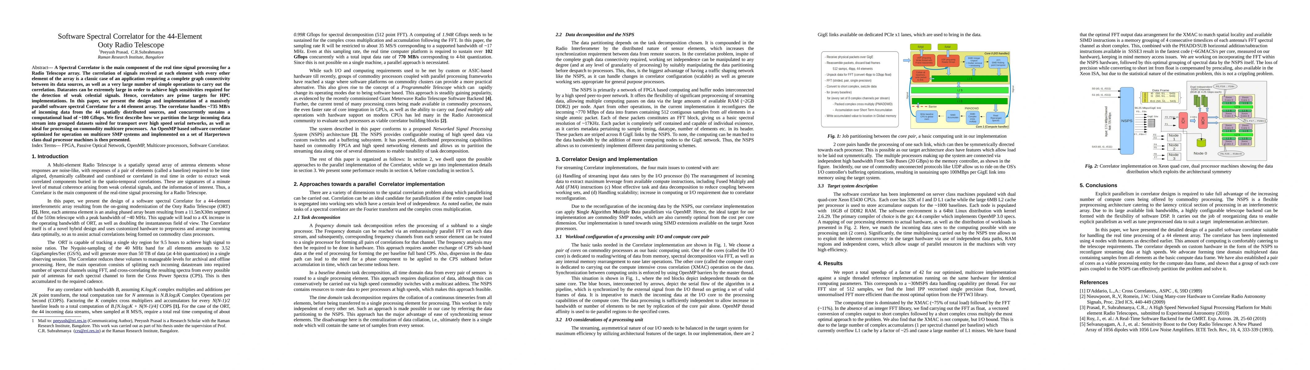 This paper details a massively parallel software spectral correlator designed for the 44-element Ooty Radio Telescope, which processes ~735 MB/s of data and sustains ~100 Gflops of computational load. The correlator employs OpenMP optimization on multicore systems to handle the large data streams and high computational demands.