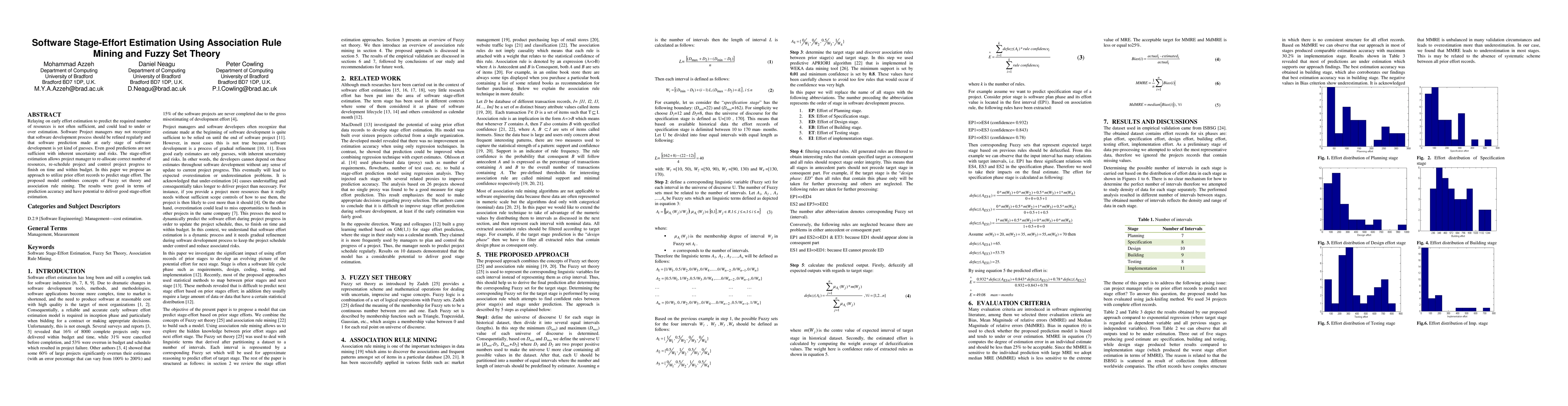 This paper proposes a novel approach to software stage-effort estimation using a combination of association rule mining and fuzzy set theory to improve prediction accuracy. The proposed model leverages prior effort records to refine early-stage predictions, aiding project managers in resource allocation and project scheduling.