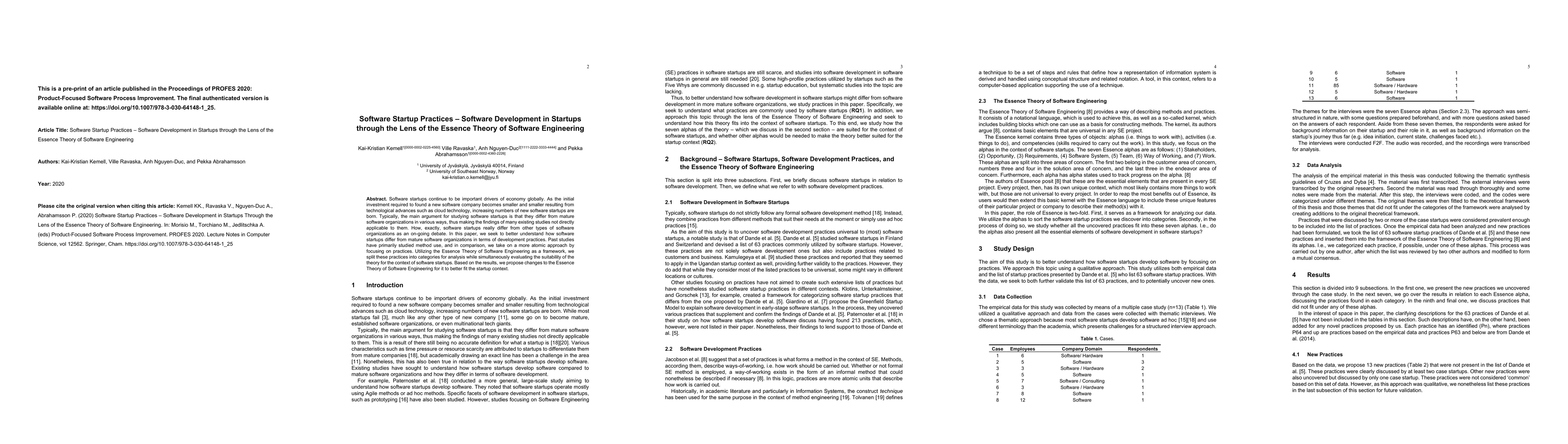 This paper investigates how software startups differ from mature software organizations in their development practices, using the Essence Theory of Software Engineering as a framework. It proposes modifications to the theory to better fit the startup context, highlighting unique practices that distinguish startup environments.