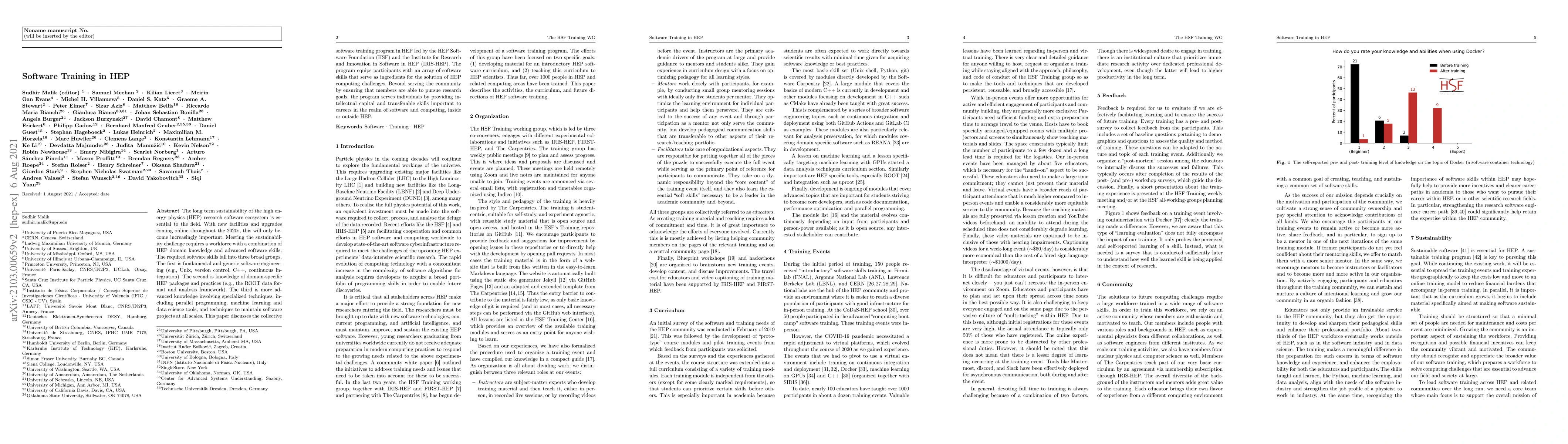 The paper discusses the importance of long-term sustainability in the high energy physics (HEP) research software ecosystem and outlines a collective training program led by the HEP Software Foundation and IRIS-HEP to equip researchers with essential software skills, including fundamental software engineering, domain-specific HEP tools, and advanced techniques like parallel programming and machine learning. The program aims to meet the growing computing challenges in HEP and enhance individual career prospects in software and computing.