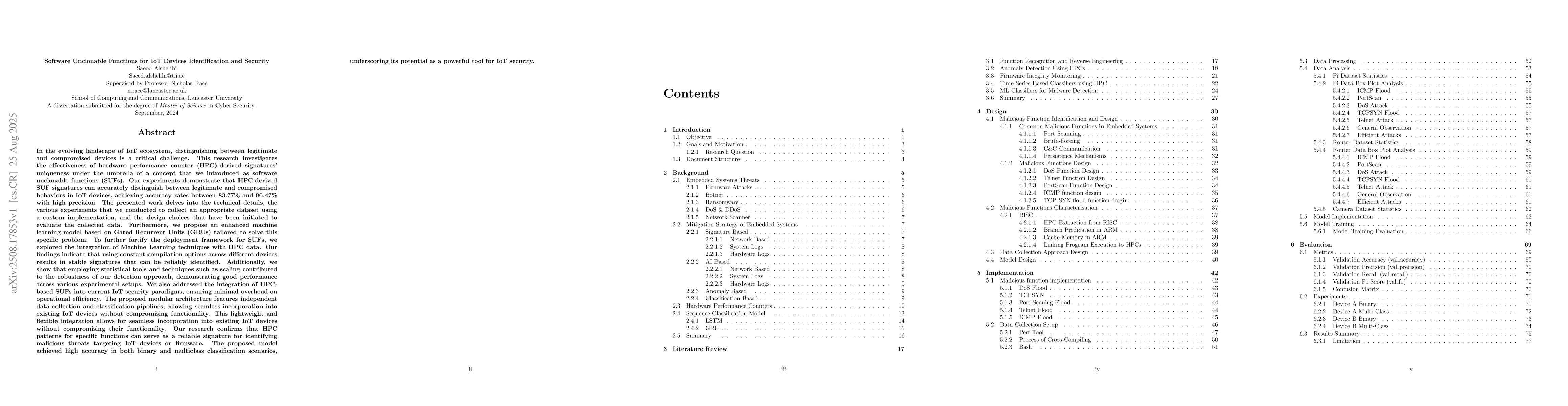 In the evolving landscape of IoT ecosystem, distinguishing between legitimate and compromised devices is a critical challenge. This research investigates the effectiveness of hardware performance counter (HPC)-derived signatures' uniqueness under the umbrella of a concept that we introduced as software unclonable functions (SUFs).