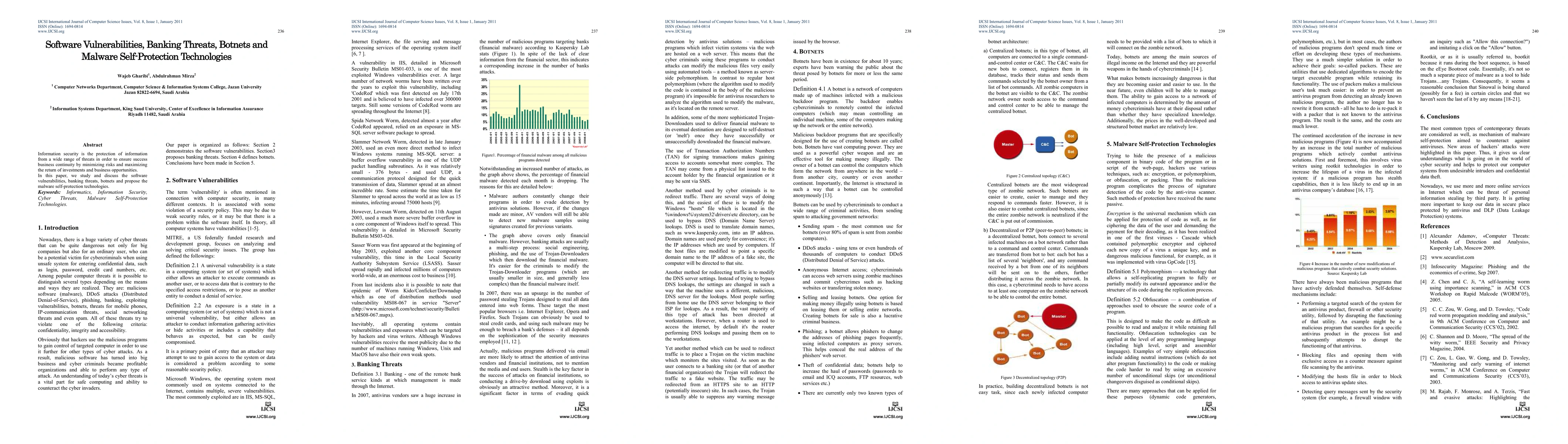 Information security is the protection of information from a wide range of threats in order to ensure success business continuity by minimizing risks and maximizing the return of investments and business opportunities. In this paper, we study and discuss the software vulnerabilities, banking threats, botnets and propose the malware self-protection technologies.