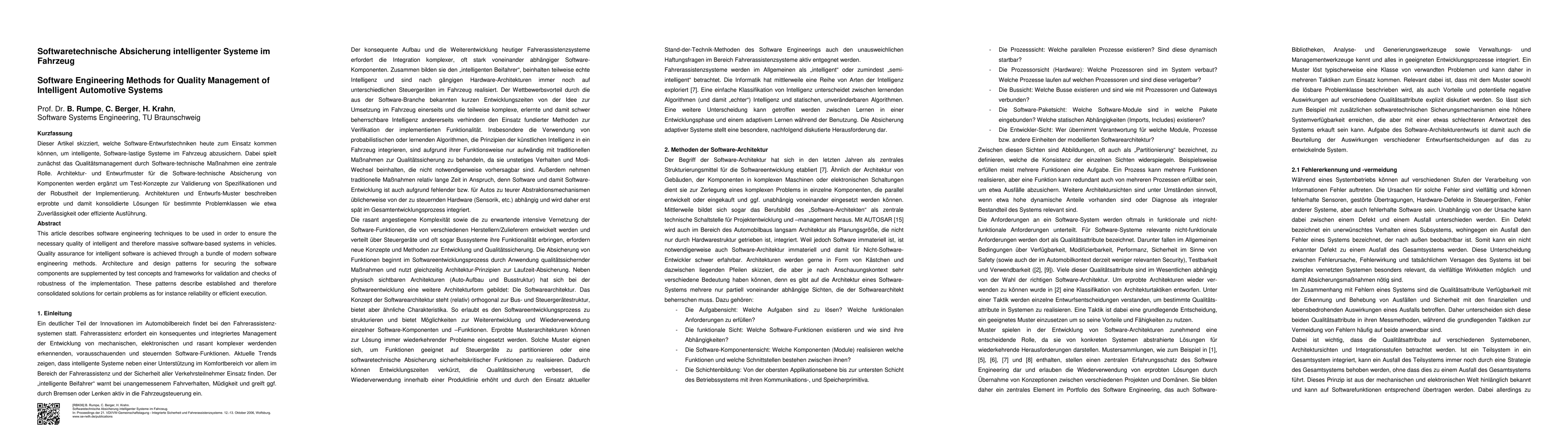 "This article describes software engineering techniques to be used in order to ensure the necessary quality of intelligent and therefore massive software-based systems in vehicles. Quality assurance for intelligent software is achieved through a bundle of modern software engineering methods. Architecture and design patterns for securing the software components are supplemented by test concepts and frameworks for validation and checks of robustness of the implementation. These patterns describe established and therefore consolidated solutions for certain problems as for instance reliability or efficient execution. -- Dieser Artikel skizziert, welche Software-Entwurfstechniken heute zum Einsatz kommen k\"onnen, um intelligente, Software-lastige Systeme im Fahrzeug abzusichern. Dabei spielt zun\"achst das Qualit\"atsmanagement durch Software-technische Ma{\ss}nahmen eine zentrale Rolle. Architektur- und Entwurfmuster f\"ur die Software-technische Absicherung von Komponenten werden erg\"anzt um Test-Konzepte zur Validierung von Spezifikationen und der Robustheit der Implementierung. Architekturen und Entwurfs-Muster beschreiben erprobte und damit konsolidierte L\"osungen f\"ur bestimmte Problemklassen wie etwa Zuverl\"assigkeit oder effiziente Ausf\"uhrung.