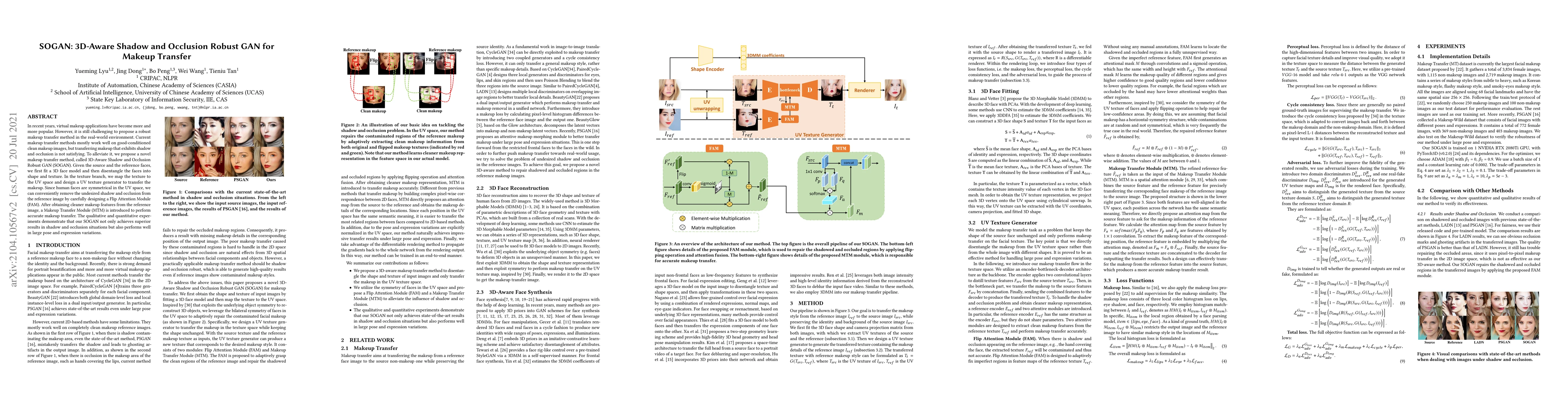 SOGAN is a novel GAN-based method for robust makeup transfer, addressing challenges in shadow and occlusion. It uses a 3D face model to disentangle shape and texture, employing a Flip Attention Module to clean makeup features before accurate transfer.