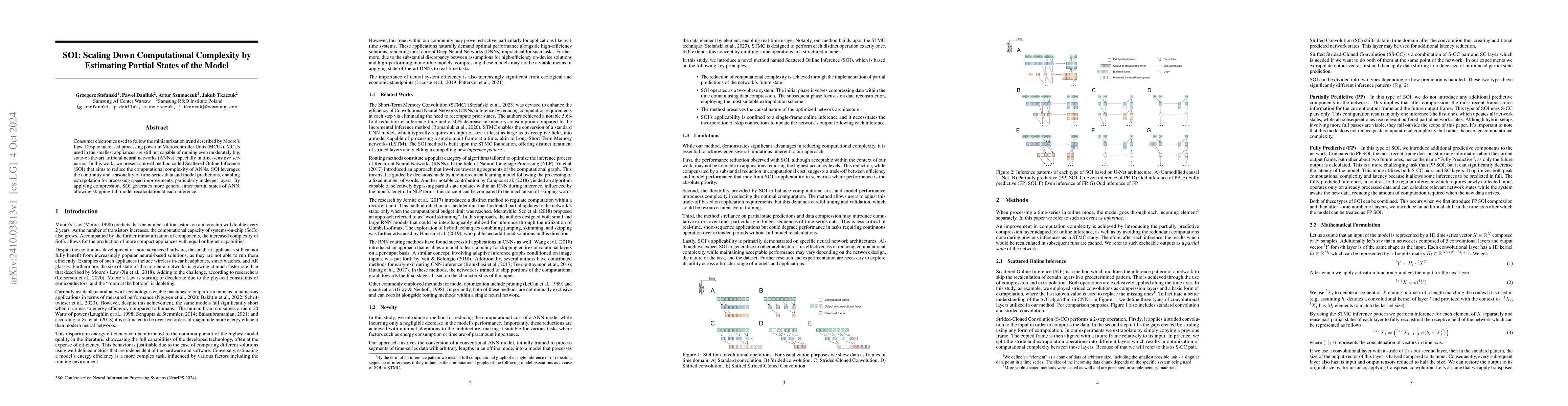 This paper introduces the Scattered Online Inference (SOI) method to reduce computational complexity in artificial neural networks (ANNs) for consumer electronics. SOI utilizes time-series data continuity and seasonality to extrapolate predictions, employing compression to generate general partial states, thereby skipping full recalculations and enhancing processing speed, especially in deeper layers.