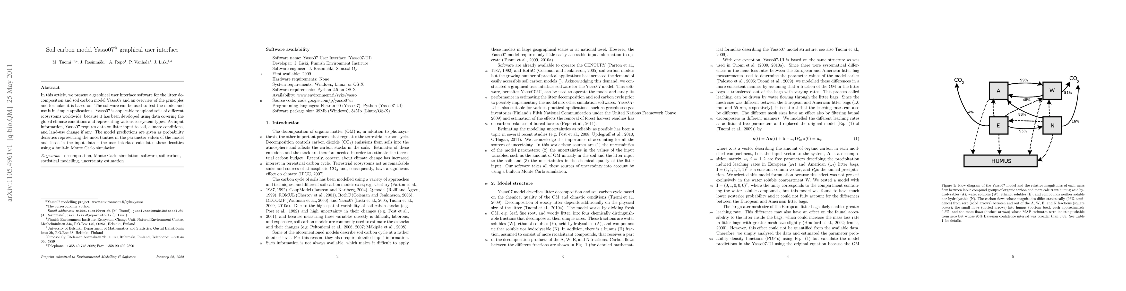 This paper introduces a graphical user interface for the Yasso07 soil carbon model, enabling users to test and apply the model for litter decomposition across diverse ecosystems. The interface uses a Monte Carlo simulation to provide probabilistic predictions, reflecting uncertainties in model parameters and input data.
