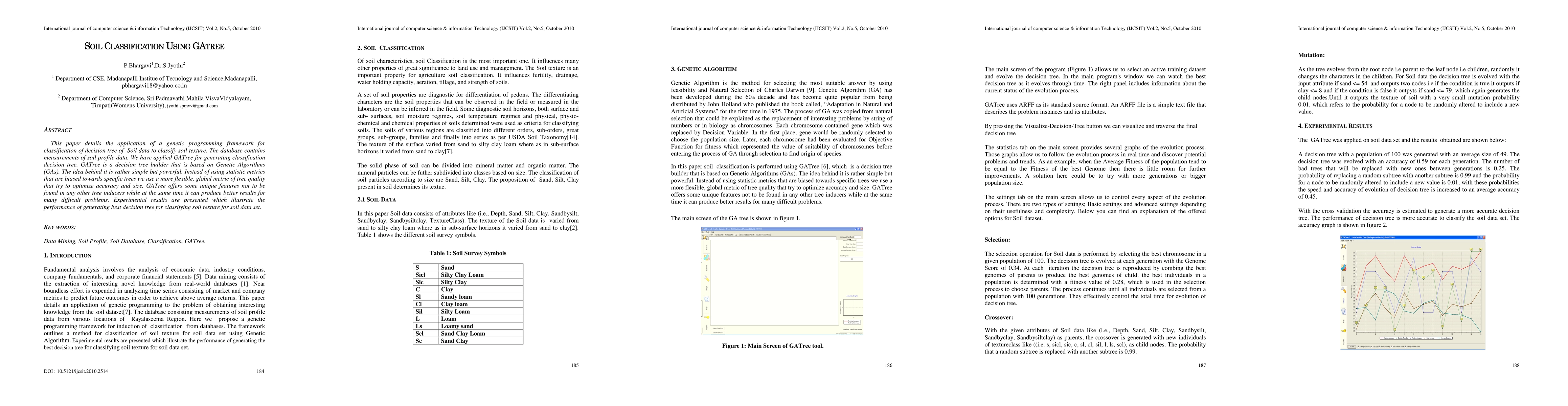 This paper applies a genetic programming framework, GATree, to classify soil texture using soil profile data. GATree optimizes decision tree accuracy and size using a global metric, offering unique features and superior performance for complex classification tasks.