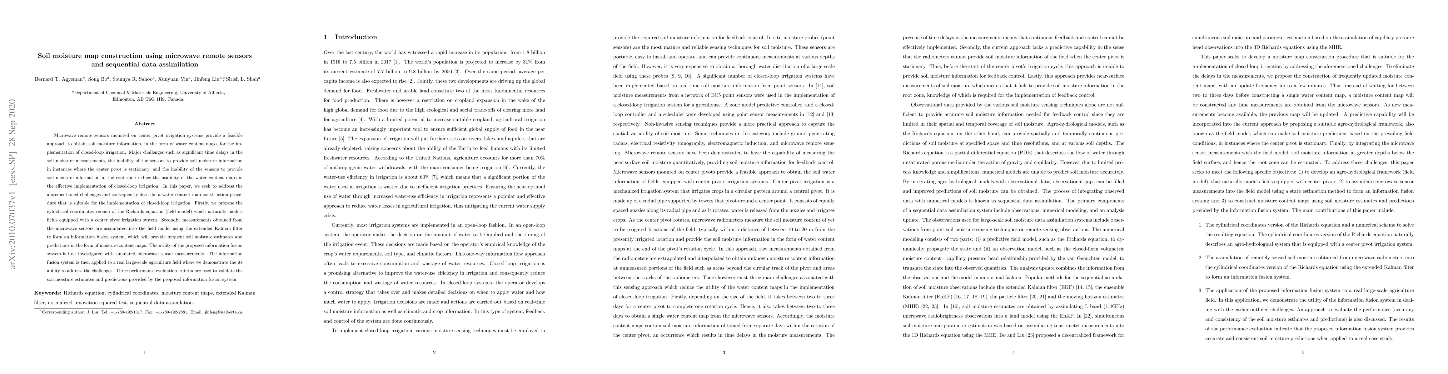 This paper proposes a method to construct soil moisture maps using microwave remote sensors and sequential data assimilation, addressing challenges like time delays and sensor limitations. It employs a cylindrical version of the Richards equation and an extended Kalman filter for information fusion to provide frequent soil moisture estimates, validated through simulations and real-field applications.