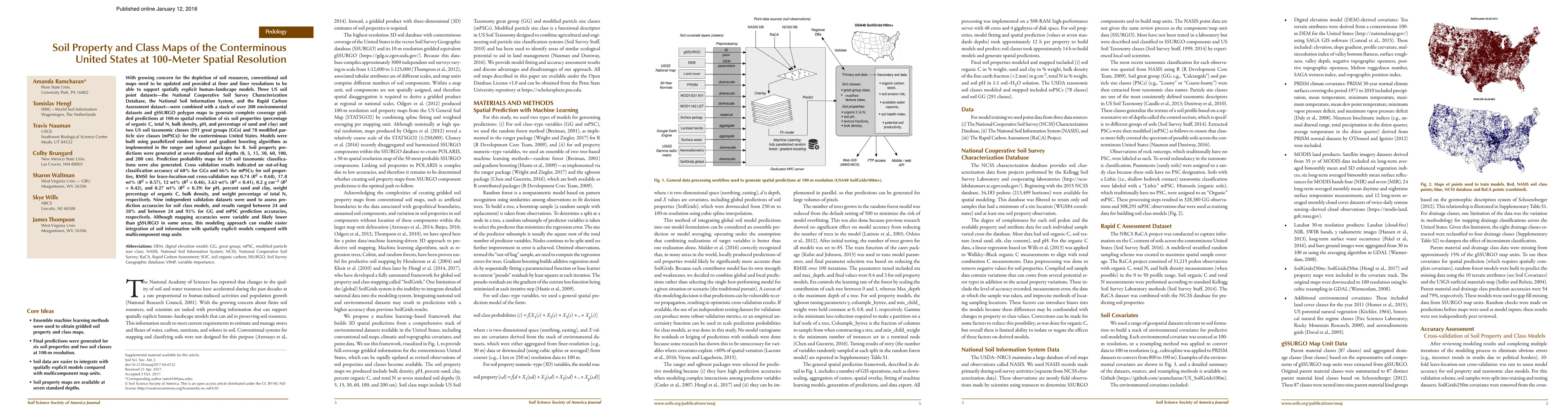 This study combines national soil point observations with over 200 environmental datasets and machine learning to generate 100-meter resolution soil property and class maps for the US. The hybrid "SoilGrids+" system achieved high accuracy in predicting soil properties and classifications, facilitating integration with spatially explicit human-landscape models.