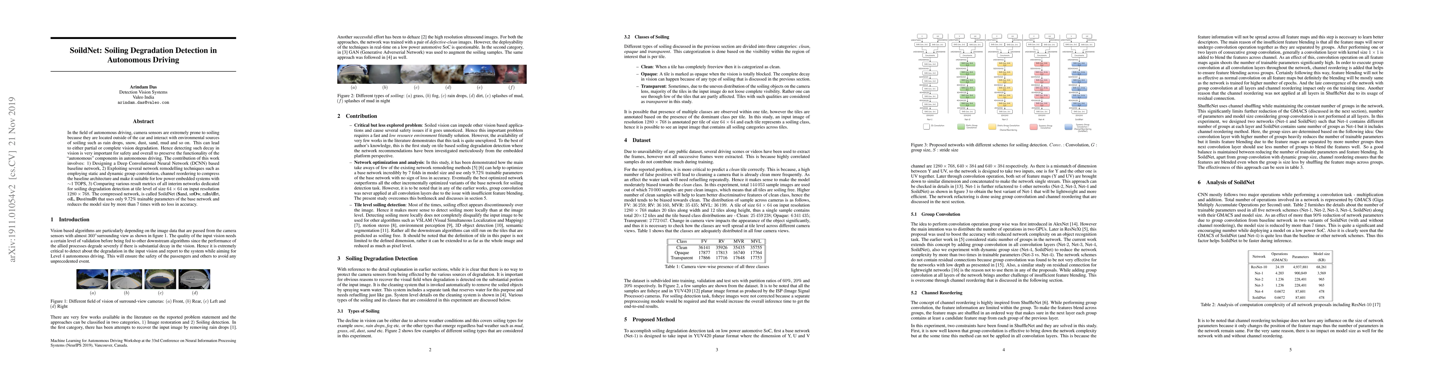 SoildNet is a Deep Convolutional Neural Network designed to detect soiling degradation on camera sensors in autonomous driving, employing techniques like static and dynamic group convolution to compress the model size significantly while maintaining accuracy. The compressed network uses only 9.72% of the parameters of the base network and reduces the model size by over 7 times.