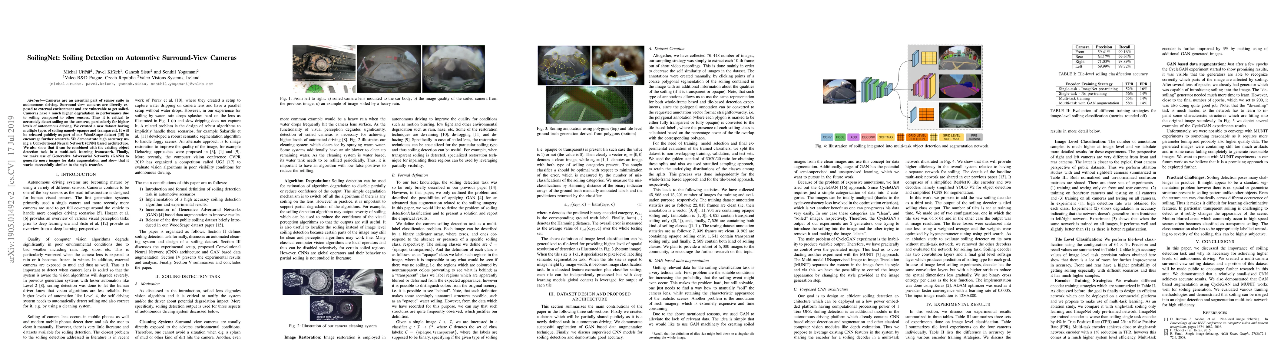 This research introduces a method for detecting soiling on automotive surround-view cameras using a Convolutional Neural Network (CNN) and a new publicly available dataset. The study highlights the importance of maintaining camera performance for autonomous driving and demonstrates the effectiveness of combining soiling detection with existing object detection tasks in a multi-task learning framework. For further details, please refer to the original paper.