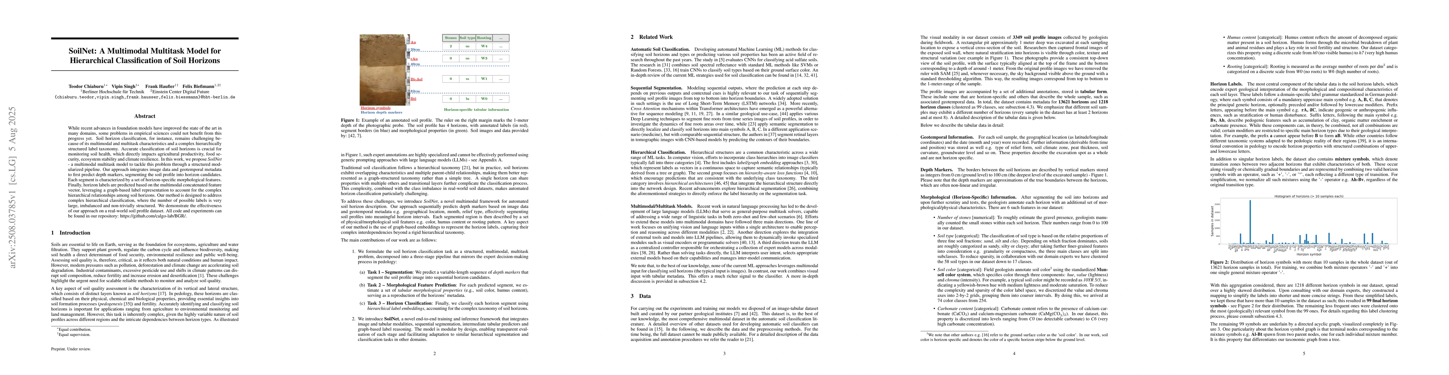 While recent advances in foundation models have improved the state of the art in many domains, some problems in empirical sciences could not benefit from this progress yet. Soil horizon classification, for instance, remains challenging because of its multimodal and multitask characteristics and a complex hierarchically structured label taxonomy. Accurate classification of soil horizons is crucial for monitoring soil health, which directly impacts agricultural productivity, food security, ecosystem stability and climate resilience. In this work, we propose $\textit{SoilNet}$ - a multimodal multitask model to tackle this problem through a structured modularized pipeline. Our approach integrates image data and geotemporal metadata to first predict depth markers, segmenting the soil profile into horizon candidates. Each segment is characterized by a set of horizon-specific morphological features. Finally, horizon labels are predicted based on the multimodal concatenated feature vector, leveraging a graph-based label representation to account for the complex hierarchical relationships among soil horizons. Our method is designed to address complex hierarchical classification, where the number of possible labels is very large, imbalanced and non-trivially structured. We demonstrate the effectiveness of our approach on a real-world soil profile dataset. All code and experiments can be found in our repository: https://github.com/calgo-lab/BGR/