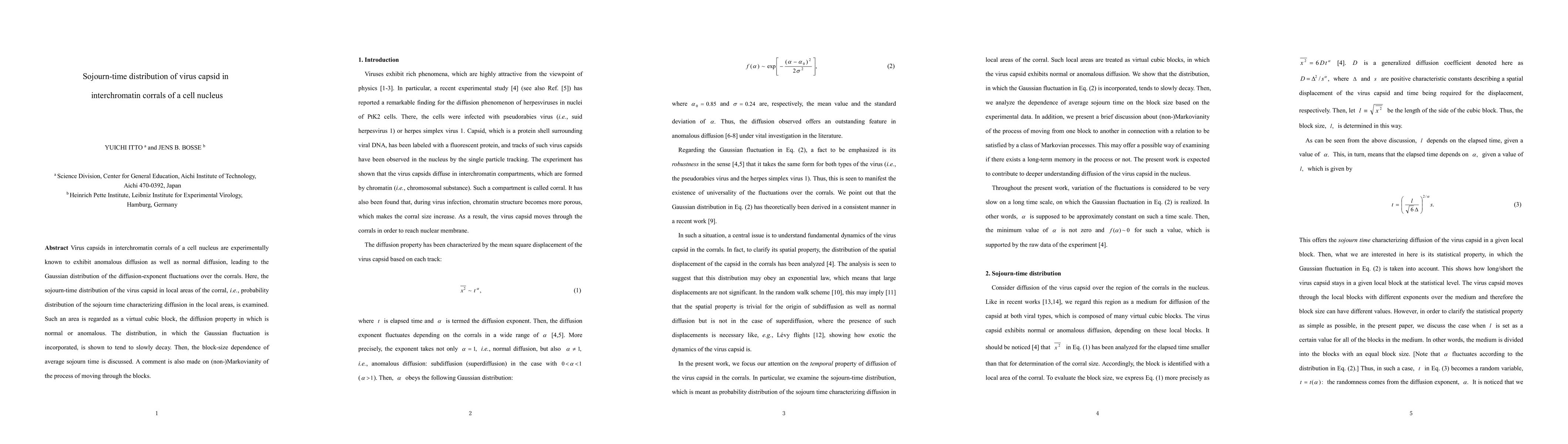 This paper investigates the sojourn-time distribution of virus capsids in interchromatin corrals within a cell nucleus, revealing both anomalous and normal diffusion. The study finds that the distribution tends to slowly decay and discusses the dependence of the average sojourn time on the size of the diffusion area, while also considering the (non-)Markovianity of the diffusion process.