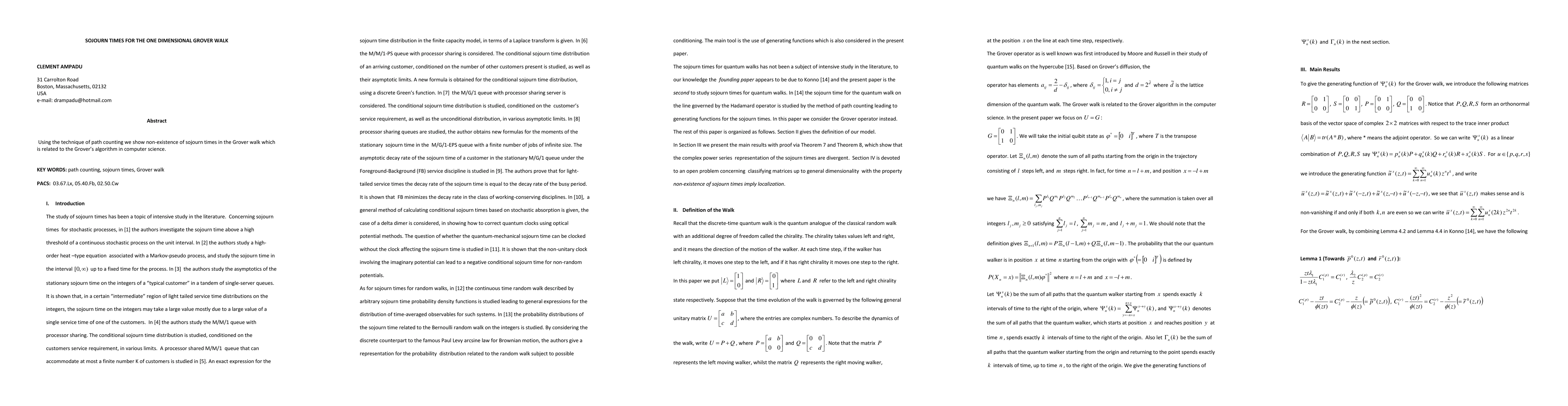 Summary: The paper demonstrates that the one-dimensional Grover walk does not exhibit sojourn times through path counting techniques, challenging the existence of such times in the context of Grover's algorithm. This finding has implications for understanding quantum search processes.