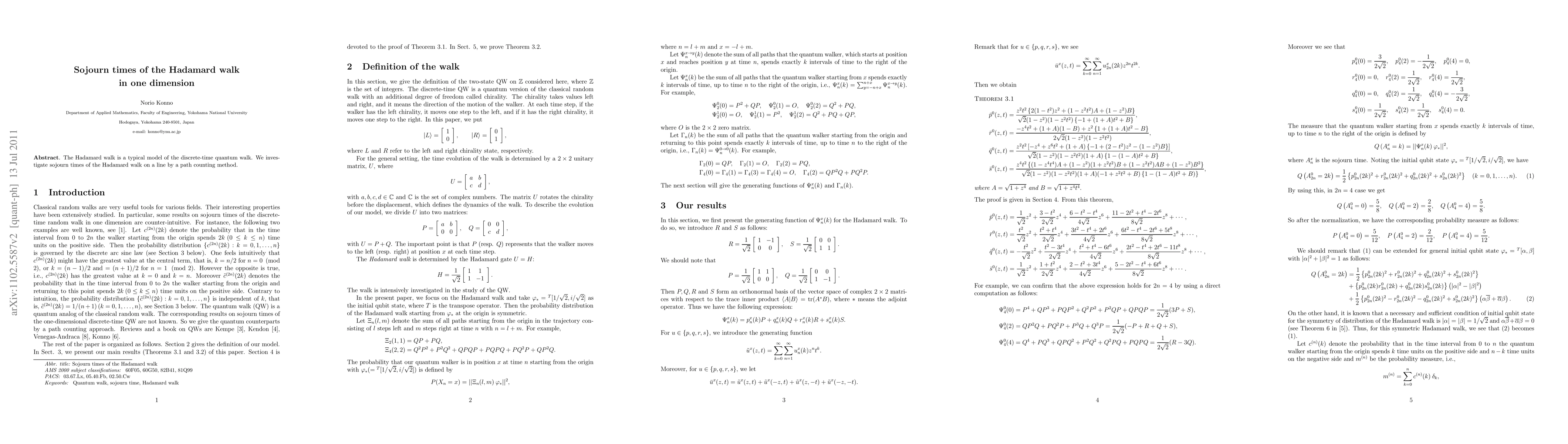 Summary: This paper investigates the sojourn times of the Hadamard walk, a discrete-time quantum walk model, on a one-dimensional line using a path counting method to analyze its behavior. The study provides insights into the distribution and characteristics of the walk's sojourn times.