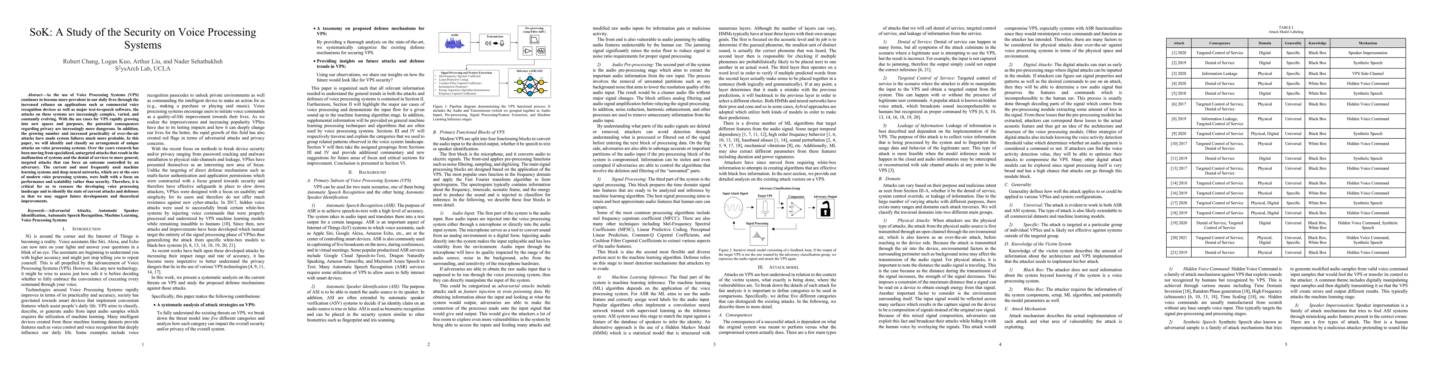As the use of Voice Processing Systems (VPS) continues to become more prevalent in our daily lives through the increased reliance on applications such as commercial voice recognition devices as well as major text-to-speech software, the attacks on these systems are increasingly complex, varied, and constantly evolving. With the use cases for VPS rapidly growing into new spaces and purposes, the potential consequences regarding privacy are increasingly more dangerous. In addition, the growing number and increased practicality of over-the-air attacks have made system failures much more probable. In this paper, we will identify and classify an arrangement of unique attacks on voice processing systems. Over the years research has been moving from specialized, untargeted attacks that result in the malfunction of systems and the denial of services to more general, targeted attacks that can force an outcome controlled by an adversary. The current and most frequently used machine learning systems and deep neural networks, which are at the core of modern voice processing systems, were built with a focus on performance and scalability rather than security. Therefore, it is critical for us to reassess the developing voice processing landscape and to identify the state of current attacks and defenses so that we may suggest future developments and theoretical improvements.