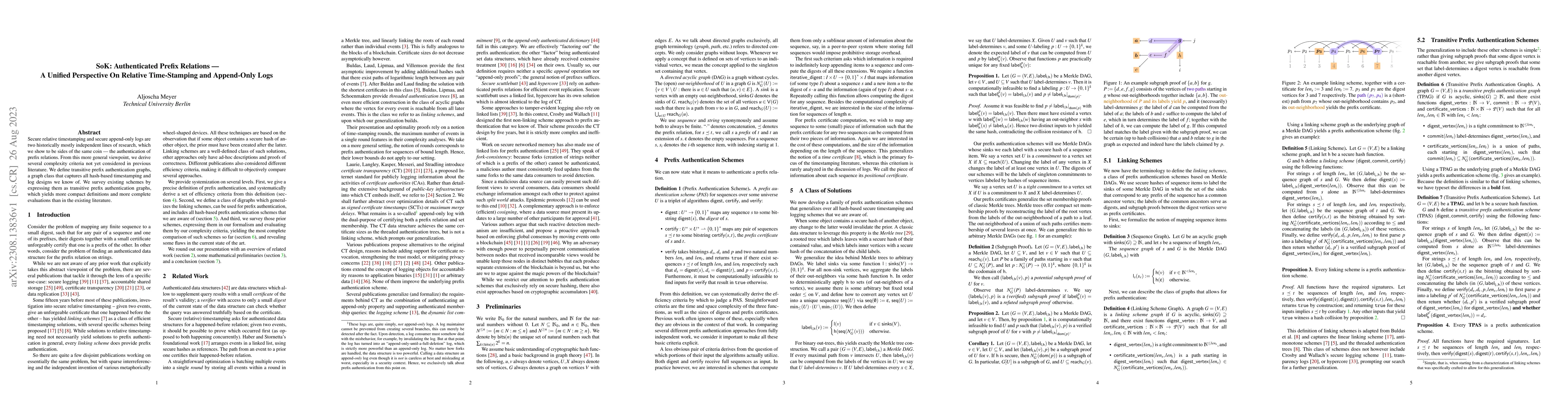 Secure relative timestamping and secure append-only logs are two historically mostly independent lines of research, which we show to be sides of the same coin -- the authentication of prefix relations. From this more general viewpoint, we derive several complexity criteria not yet considered in previous literature. We define transitive prefix authentication graphs, a graph class that captures all hash-based timestamping and log designs we know of. We survey existing schemes by expressing them as transitive prefix authentication graphs, which yields more compact definitions and more complete evaluations than in the existing literature.