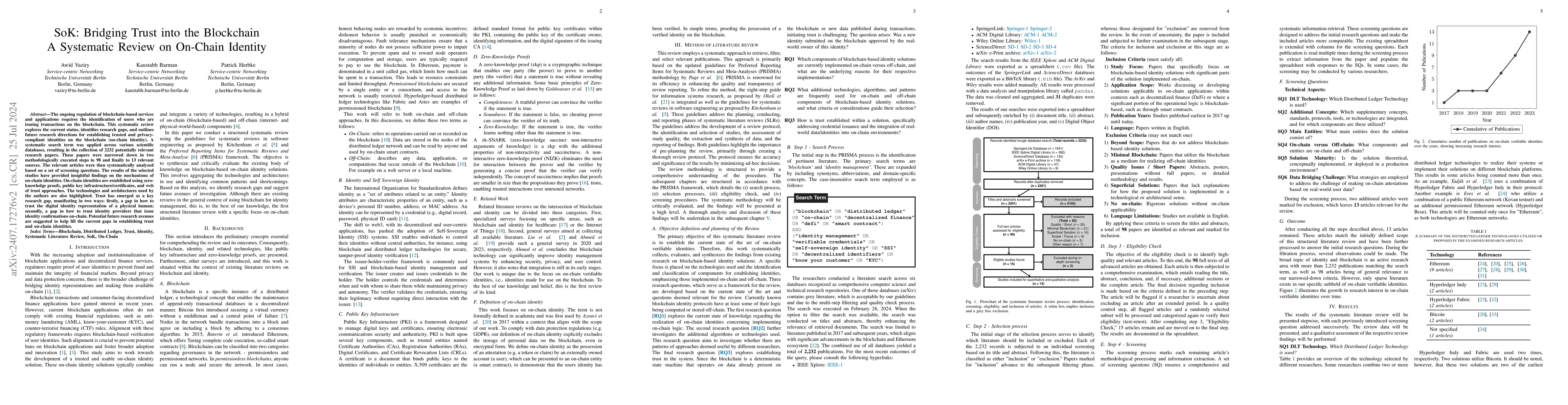 The ongoing regulation of blockchain-based services and applications requires the identification of users who are issuing transactions on the blockchain. This systematic review explores the current status, identifies research gaps, and outlines future research directions for establishing trusted and privacy-compliant identities on the blockchain (on-chain identity). A systematic search term was applied across various scientific databases, collecting 2232 potentially relevant research papers. These papers were narrowed down in two methodologically executed steps to 98 and finally to 13 relevant sources. The relevant articles were then systematically analyzed based on a set of screening questions. The results of the selected studies have provided insightful findings on the mechanisms of on-chain identities. On-chain identities are established using zero-knowledge proofs, public key infrastructure/certificates, and web of trust approaches. The technologies and architectures used by the authors are also highlighted. Trust has emerged as a key research gap, manifesting in two ways: firstly, a gap in how to trust the digital identity representation of a physical human; secondly, a gap in how to trust identity providers that issue identity confirmations on-chain. Potential future research avenues are suggested to help fill the current gaps in establishing trust and on-chain identities.