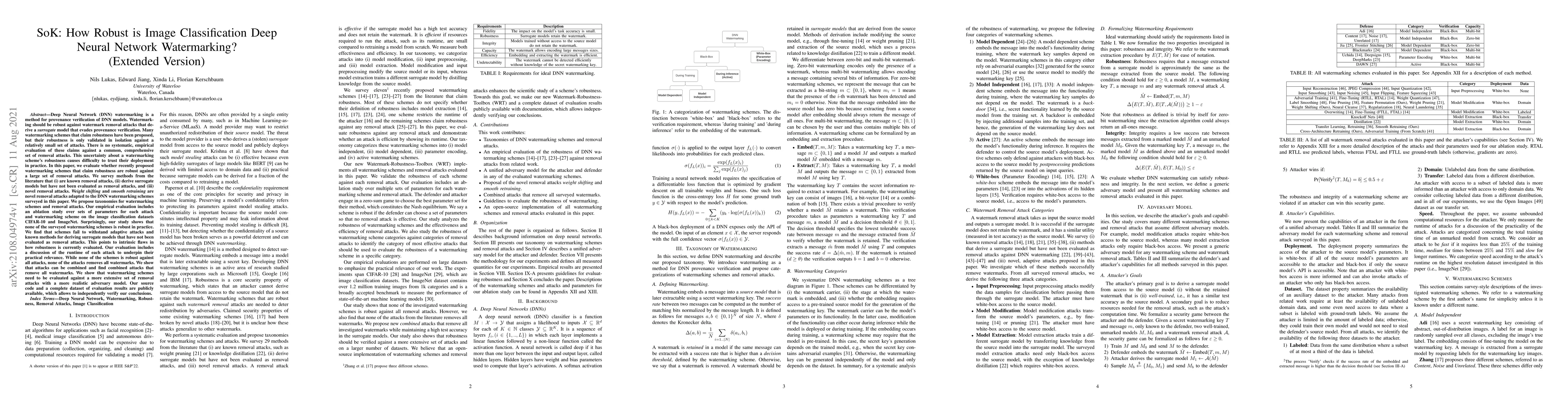 Deep Neural Network (DNN) watermarking is a method for provenance verification of DNN models. Watermarking should be robust against watermark removal attacks that derive a surrogate model that evades provenance verification. Many watermarking schemes that claim robustness have been proposed, but their robustness is only validated in isolation against a relatively small set of attacks. There is no systematic, empirical evaluation of these claims against a common, comprehensive set of removal attacks. This uncertainty about a watermarking scheme's robustness causes difficulty to trust their deployment in practice. In this paper, we evaluate whether recently proposed watermarking schemes that claim robustness are robust against a large set of removal attacks. We survey methods from the literature that (i) are known removal attacks, (ii) derive surrogate models but have not been evaluated as removal attacks, and (iii) novel removal attacks. Weight shifting and smooth retraining are novel removal attacks adapted to the DNN watermarking schemes surveyed in this paper. We propose taxonomies for watermarking schemes and removal attacks. Our empirical evaluation includes an ablation study over sets of parameters for each attack and watermarking scheme on the CIFAR-10 and ImageNet datasets. Surprisingly, none of the surveyed watermarking schemes is robust in practice. We find that schemes fail to withstand adaptive attacks and known methods for deriving surrogate models that have not been evaluated as removal attacks. This points to intrinsic flaws in how robustness is currently evaluated. We show that watermarking schemes need to be evaluated against a more extensive set of removal attacks with a more realistic adversary model. Our source code and a complete dataset of evaluation results are publicly available, which allows to independently verify our conclusions.
