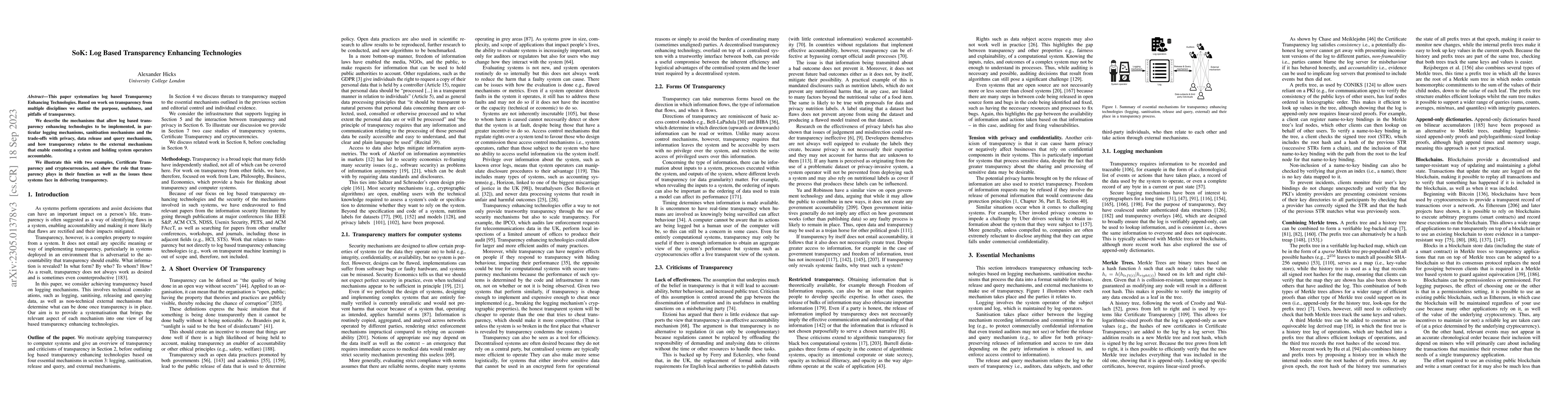 This paper systematizes log based Transparency Enhancing Technologies. Based on work on transparency from multiple disciplines we outline the purpose, usefulness, and pitfalls of transparency. We describe the mechanisms that allow log based transparency enhancing technologies to be implemented, in particular logging mechanisms, sanitisation mechanisms and the trade-offs with privacy, data release and query mechanisms, and how transparency relates to the external mechanisms that enable contesting a system and holding system operators accountable. We illustrate this with two examples, Certificate Transparency and cryptocurrencies, and show the role that transparency plays in their function as well as the issues these systems face in delivering transparency.