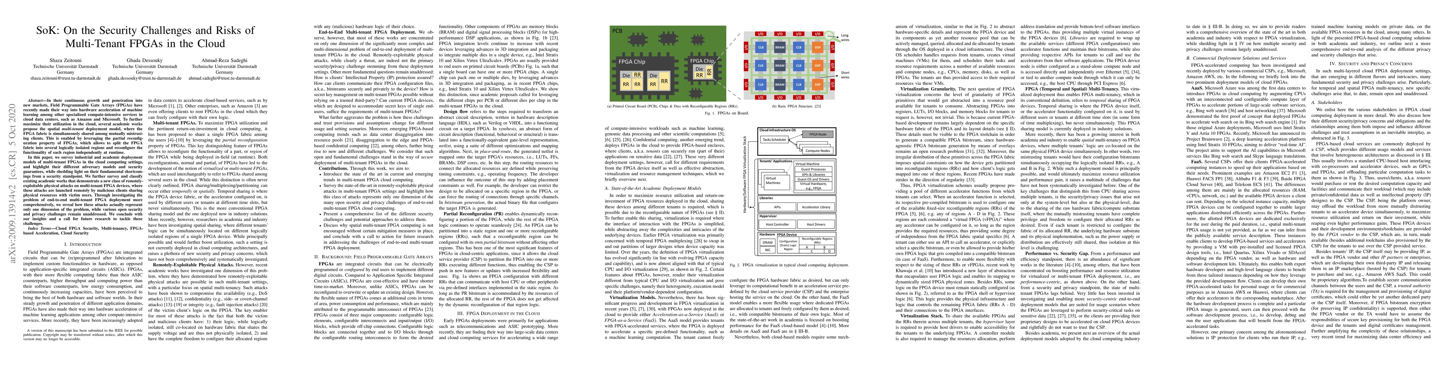 This paper surveys security challenges in multi-tenant FPGA deployments in cloud environments, highlighting existing vulnerabilities and physical attacks, and calls for further research to address the remaining security and privacy issues.