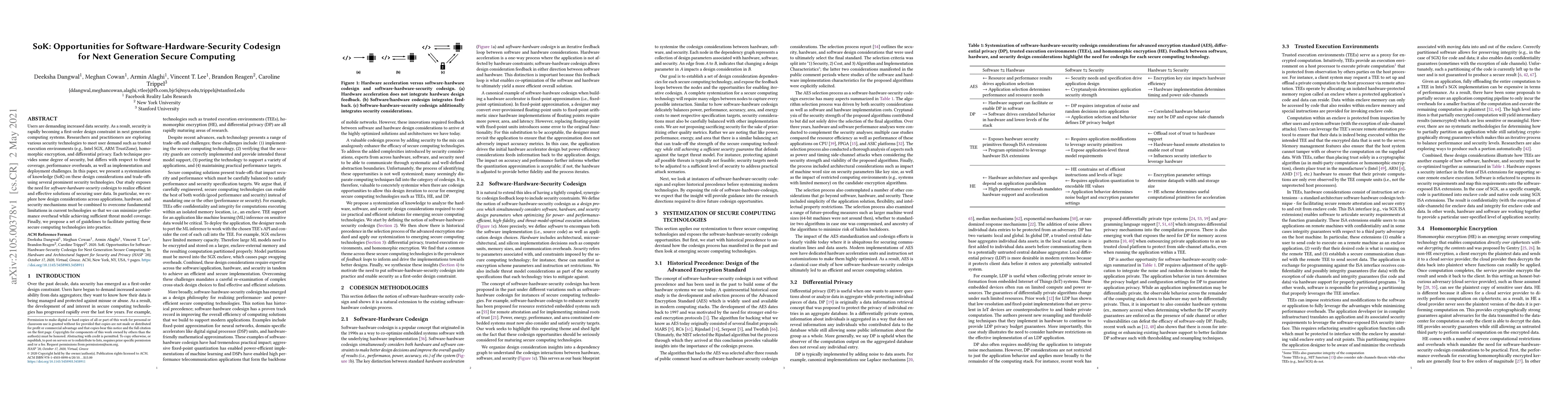 Users are demanding increased data security. As a result, security is rapidly becoming a first-order design constraint in next generation computing systems. Researchers and practitioners are exploring various security technologies to meet user demand such as trusted execution environments (e.g., Intel SGX, ARM TrustZone), homomorphic encryption, and differential privacy. Each technique provides some degree of security, but differs with respect to threat coverage, performance overheads, as well as implementation and deployment challenges. In this paper, we present a systemization of knowledge (SoK) on these design considerations and trade-offs using several prominent security technologies. Our study exposes the need for \textit{software-hardware-security} codesign to realize efficient and effective solutions of securing user data. In particular, we explore how design considerations across applications, hardware, and security mechanisms must be combined to overcome fundamental limitations in current technologies so that we can minimize performance overhead while achieving sufficient threat model coverage. Finally, we propose a set of guidelines to facilitate putting these secure computing technologies into practice.