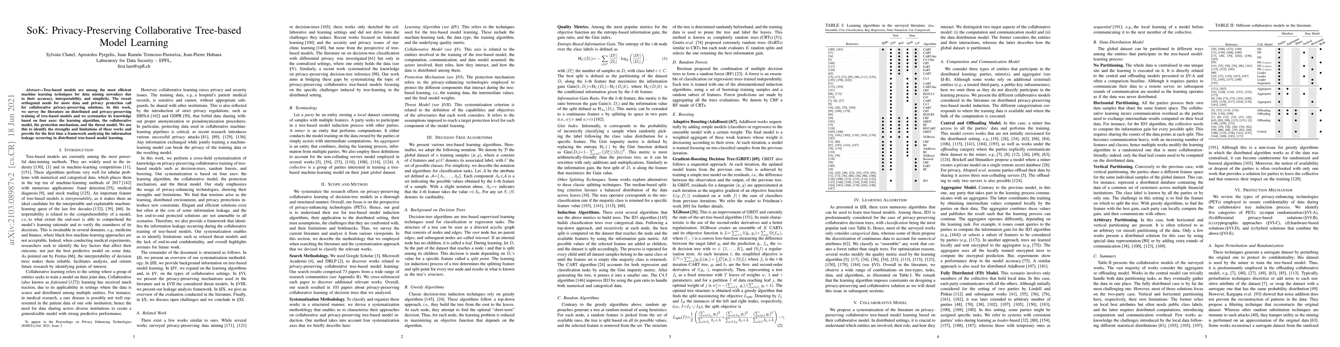 This paper surveys literature on privacy-preserving collaborative training of tree-based models, categorizing approaches based on learning algorithms, collaborative models, protection mechanisms, and threat models. It identifies strengths and limitations and introduces a framework to analyze information leakage in distributed learning.