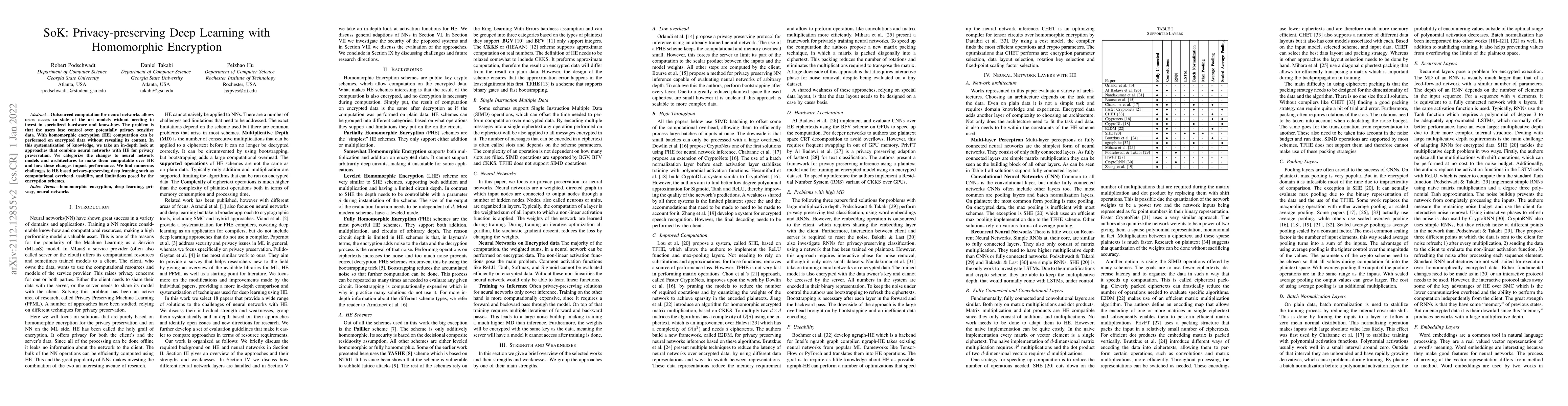 Outsourced computation for neural networks allows users access to state of the art models without needing to invest in specialized hardware and know-how. The problem is that the users lose control over potentially privacy sensitive data. With homomorphic encryption (HE) computation can be performed on encrypted data without revealing its content. In this systematization of knowledge, we take an in-depth look at approaches that combine neural networks with HE for privacy preservation. We categorize the changes to neural network models and architectures to make them computable over HE and how these changes impact performance. We find numerous challenges to HE based privacy-preserving deep learning such as computational overhead, usability, and limitations posed by the encryption schemes.