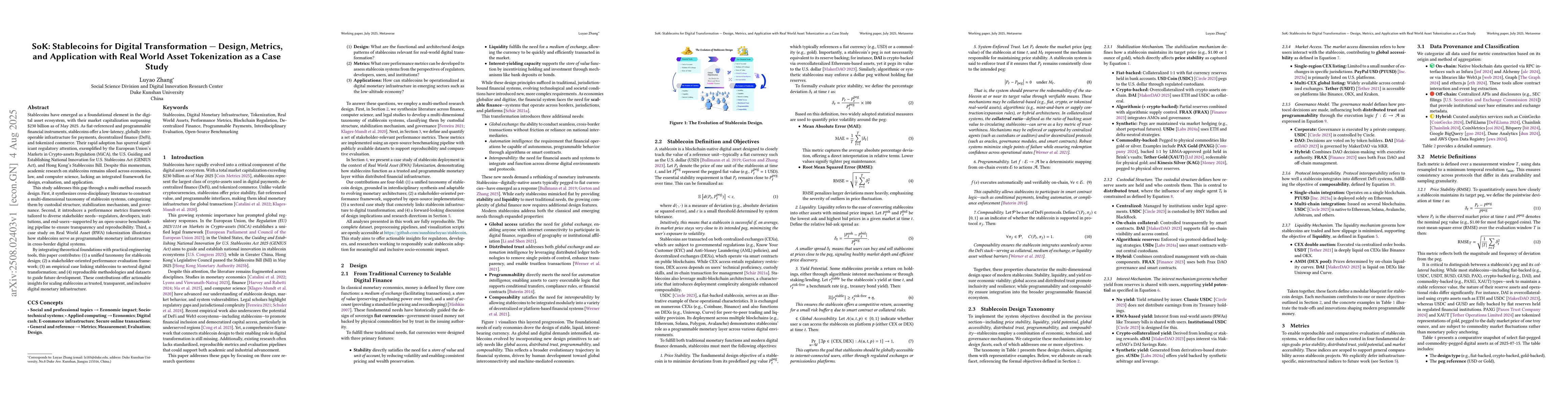 Stablecoins have become a foundational component of the digital asset ecosystem, with their market capitalization exceeding 230 billion USD as of May 2025. As fiat-referenced and programmable assets, stablecoins provide low-latency, globally interoperable infrastructure for payments, decentralized finance, DeFi, and tokenized commerce. Their accelerated adoption has prompted extensive regulatory engagement, exemplified by the European Union's Markets in Crypto-assets Regulation, MiCA, the US Guiding and Establishing National Innovation for US Stablecoins Act, GENIUS Act, and Hong Kong's Stablecoins Bill. Despite this momentum, academic research remains fragmented across economics, law, and computer science, lacking a unified framework for design, evaluation, and application. This study addresses that gap through a multi-method research design. First, it synthesizes cross-disciplinary literature to construct a taxonomy of stablecoin systems based on custodial structure, stabilization mechanism, and governance. Second, it develops a performance evaluation framework tailored to diverse stakeholder needs, supported by an open-source benchmarking pipeline to ensure transparency and reproducibility. Third, a case study on Real World Asset tokenization illustrates how stablecoins operate as programmable monetary infrastructure in cross-border digital systems. By integrating conceptual theory with empirical tools, the paper contributes: a unified taxonomy for stablecoin design; a stakeholder-oriented performance evaluation framework; an empirical case linking stablecoins to sectoral transformation; and reproducible methods and datasets to inform future research. These contributions support the development of trusted, inclusive, and transparent digital monetary infrastructure.