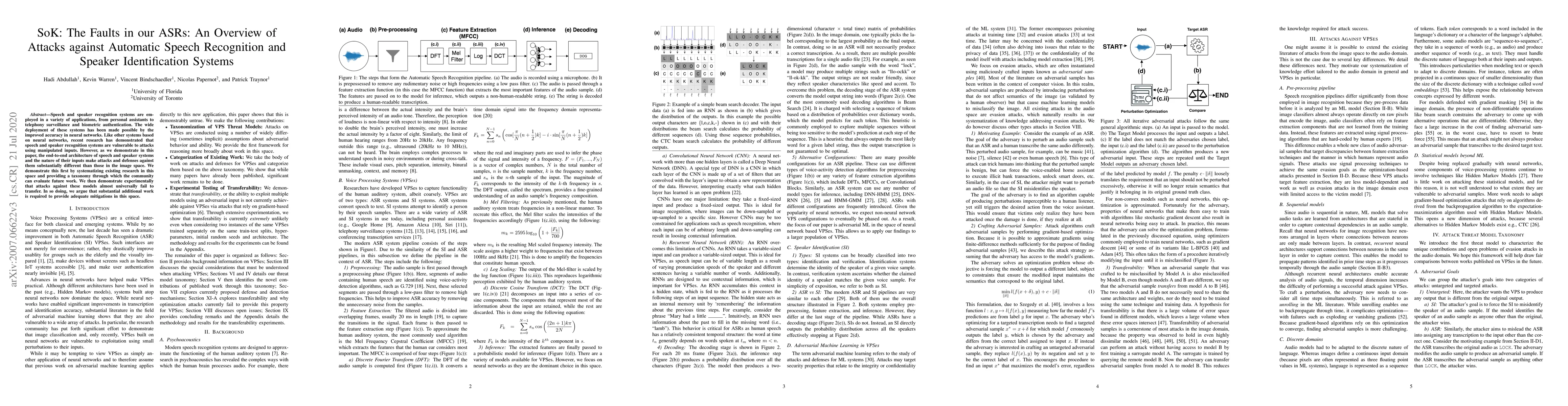 Speech and speaker recognition systems are employed in a variety of applications, from personal assistants to telephony surveillance and biometric authentication. The wide deployment of these systems has been made possible by the improved accuracy in neural networks. Like other systems based on neural networks, recent research has demonstrated that speech and speaker recognition systems are vulnerable to attacks using manipulated inputs. However, as we demonstrate in this paper, the end-to-end architecture of speech and speaker systems and the nature of their inputs make attacks and defenses against them substantially different than those in the image space. We demonstrate this first by systematizing existing research in this space and providing a taxonomy through which the community can evaluate future work. We then demonstrate experimentally that attacks against these models almost universally fail to transfer. In so doing, we argue that substantial additional work is required to provide adequate mitigations in this space.