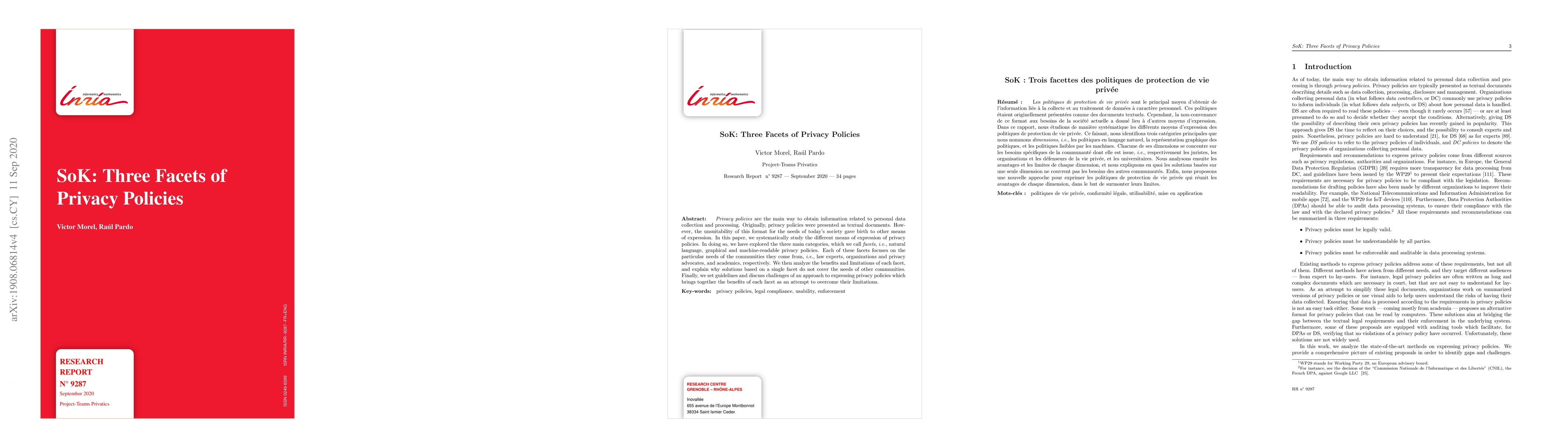 Privacy policies are the main way to obtain information related to personal data collection and processing. Originally, privacy policies were presented as textual documents. However, the unsuitability of this format for the needs of today's society gave birth to other means of expression. In this paper, we systematically study the different means of expression of privacy policies. In doing so, we have explored the three main categories, which we call facets, ie, natural language, graphical and machine-readable privacy policies. Each of these facets focuses on the particular needs of the communities they come from, ie, law experts, organizations and privacy advocates, and academics, respectively. We then analyze the benefits and limitations of each facet, and explain why solutions based on a single facet do not cover the needs of other communities. Finally, we set guidelines and discuss challenges of an approach to expressing privacy policies which brings together the benefits of each facet as an attempt to overcome their limitations.
