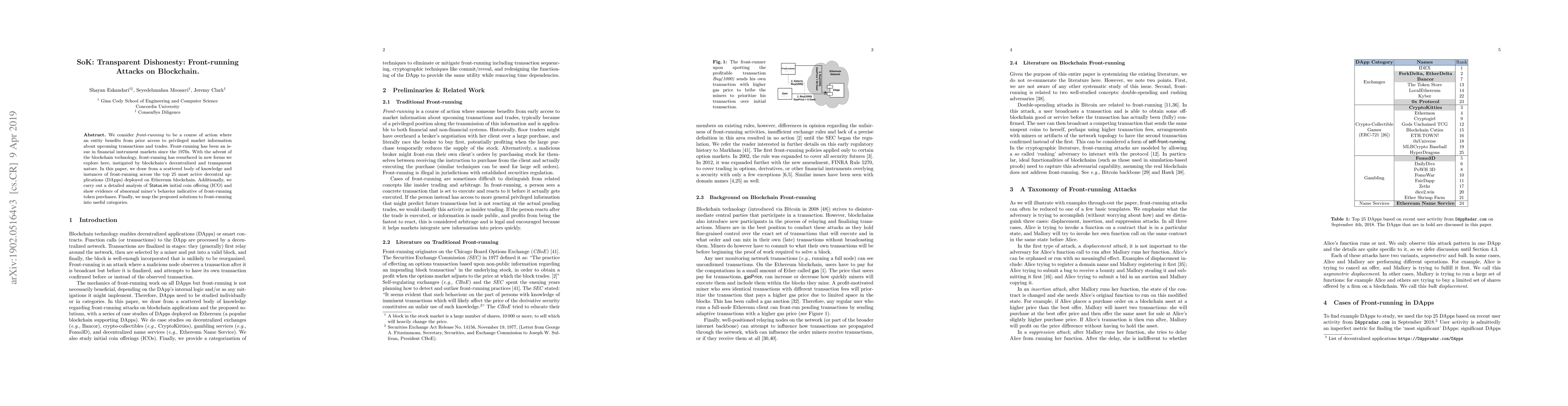 This paper examines front-running attacks in blockchain, where entities exploit privileged information for profit, and analyzes instances across top Ethereum DApps. It also investigates abnormal miner behavior during a Status.im ICO, providing evidence of front-running, and categorizes existing solutions to this issue.