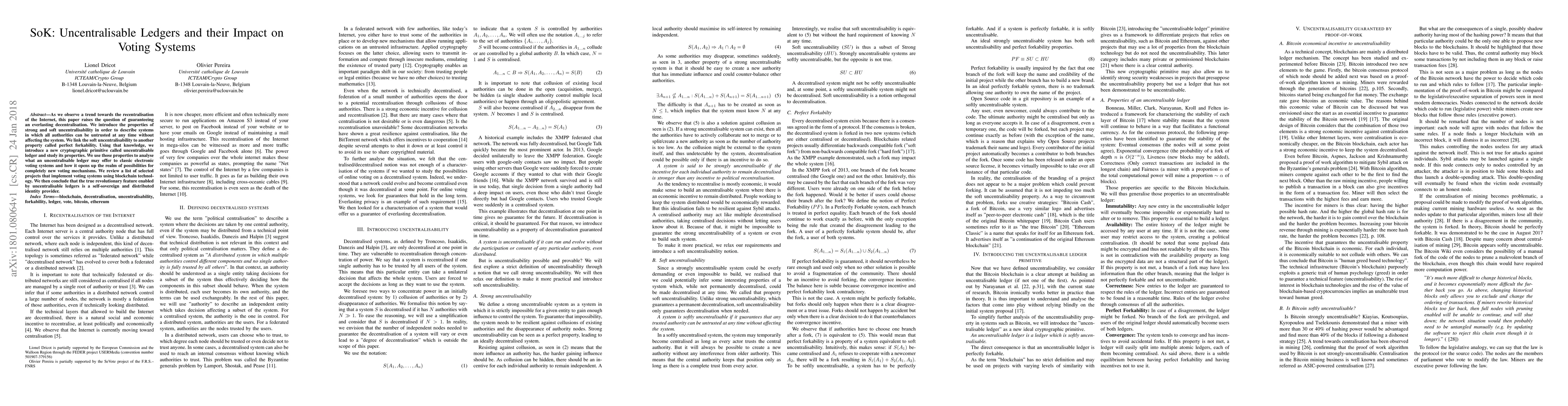 As we observe a trend towards the recentralisation of the Internet, this paper raises the question of guaranteeing an everlasting decentralisation. We introduce the properties of strong and soft uncentralisability in order to describe systems in which all authorities can be untrusted at any time without affecting the system. We link the soft uncentralisability to another property called perfect forkability. Using that knowledge, we introduce a new cryptographic primitive called uncentralisable ledger and study its properties. We use those properties to analyse what an uncentralisable ledger may offer to classic electronic voting systems and how it opens up the realm of possibilities for completely new voting mechanisms. We review a list of selected projects that implement voting systems using blockchain technol- ogy. We then conclude that the true revolutionary feature enabled by uncentralisable ledgers is a self-sovereign and distributed identity provider.