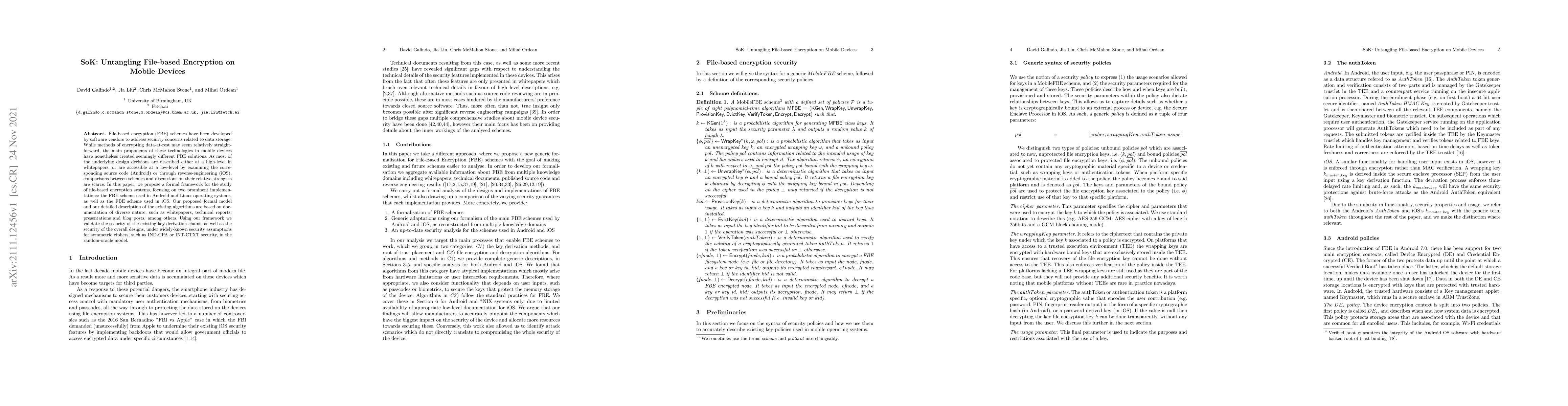 This paper proposes a formal framework to analyze file-based encryption (FBE) schemes on mobile devices, focusing on two major implementations in Android and iOS. It validates the security of key derivation chains and overall designs under standard security assumptions.