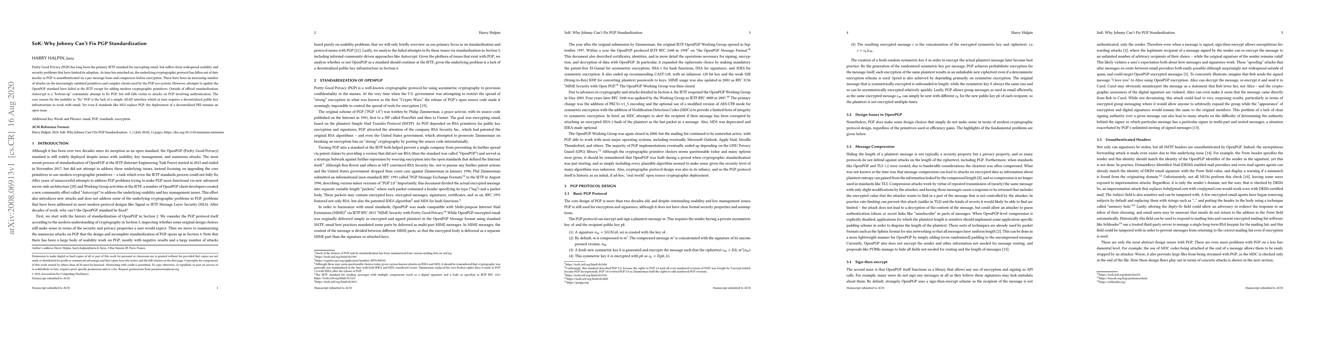 This paper discusses the challenges in standardizing Pretty Good Privacy (PGP) due to its outdated cryptographic protocol and complex client issues, leading to security vulnerabilities. Efforts to update the OpenPGP standard have been unsuccessful, and decentralized public key infrastructures remain a significant hurdle for effective implementation.