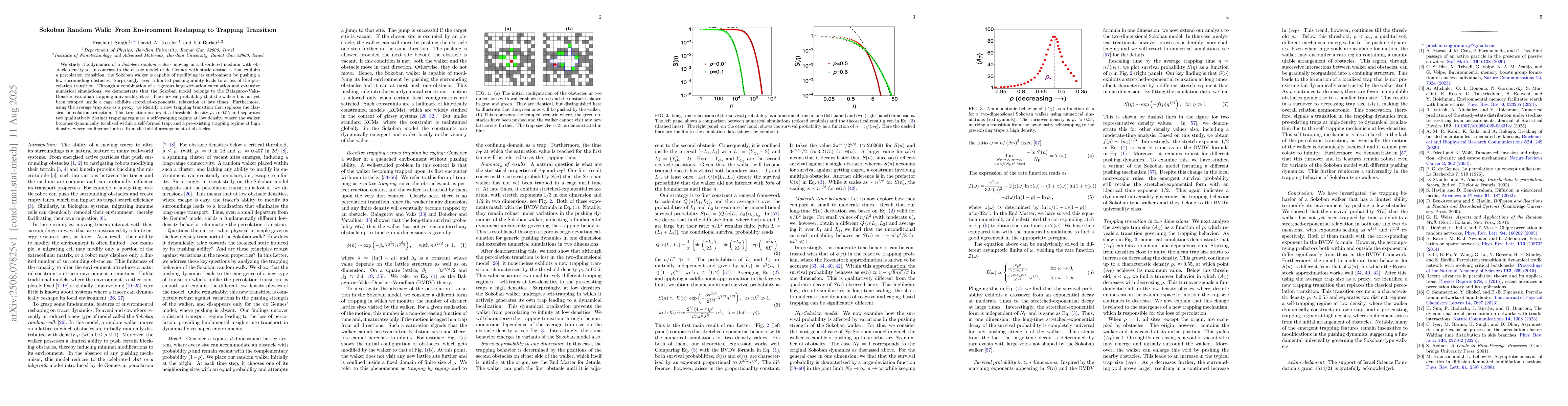 We study the dynamics of a $\textit{Sokoban random walker}$ moving in a disordered medium with obstacle density $\rho$. In contrast to the classic model of de Gennes with static obstacles that exhibits a percolation transition, the Sokoban walker is capable of modifying its environment by pushing a few surrounding obstacles. Surprisingly, even a limited pushing ability leads to a loss of the percolation transition. Through a combination of a rigorous large-deviation calculation and extensive numerical simulations, we demonstrate that the Sokoban model belongs to the Balagurov-Vaks-Donsker-Varadhan trapping universality class. The survival probability that the walker has not yet been trapped inside a cage exhibits stretched-exponential relaxation at late times. Furthermore, using the average trap size as a proxy, we identify a new trapping transition that replaces the classical percolation transition. This transition occurs at a threshold density $\rho_* \approx 0.55$ and separates two qualitatively distinct trapping regimes: a self-trapping regime at low density, where the walker becomes dynamically localized within a self-formed trap, and a pre-existing trapping regime at high density, where confinement arises from the initial arrangement of obstacles.