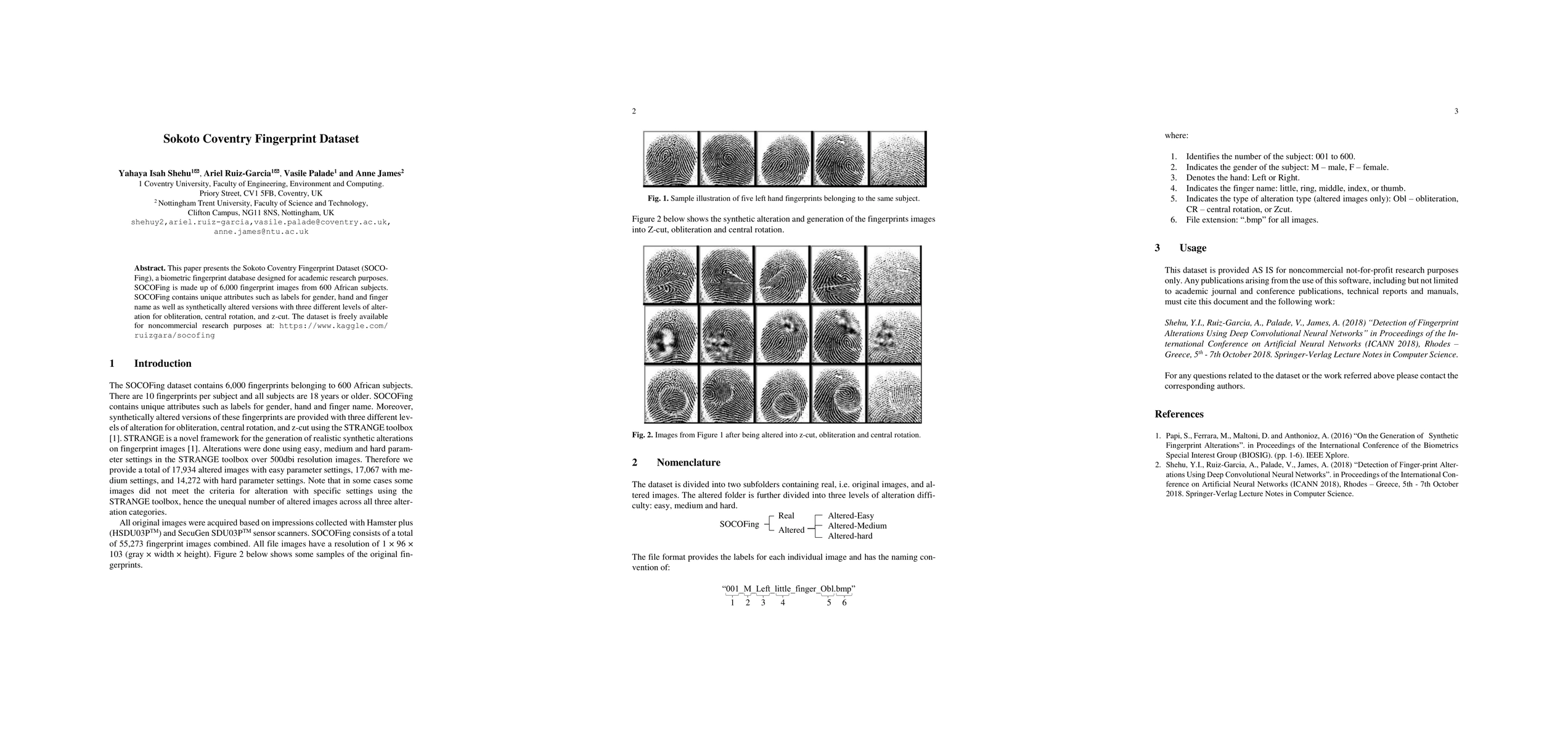 This paper presents the Sokoto Coventry Fingerprint Dataset (SOCOFing), a biometric fingerprint database designed for academic research purposes. SOCOFing is made up of 6,000 fingerprint images from 600 African subjects. SOCOFing contains unique attributes such as labels for gender, hand and finger name as well as synthetically altered versions with three different levels of alteration for obliteration, central rotation, and z-cut. The dataset is freely available for noncommercial research purposes at: https://www.kaggle.com/ruizgara/socofing