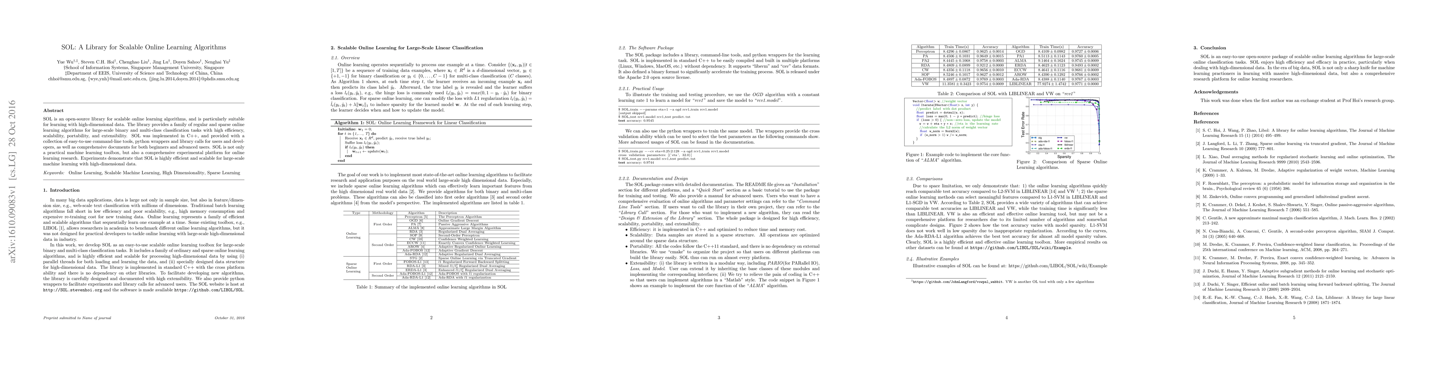 SOL is an open-source library for scalable online learning algorithms designed for high-dimensional data, offering efficient and extensible tools for binary and multi-class classification tasks. It includes C++ implementation, command-line tools, python wrappers, and comprehensive documentation.