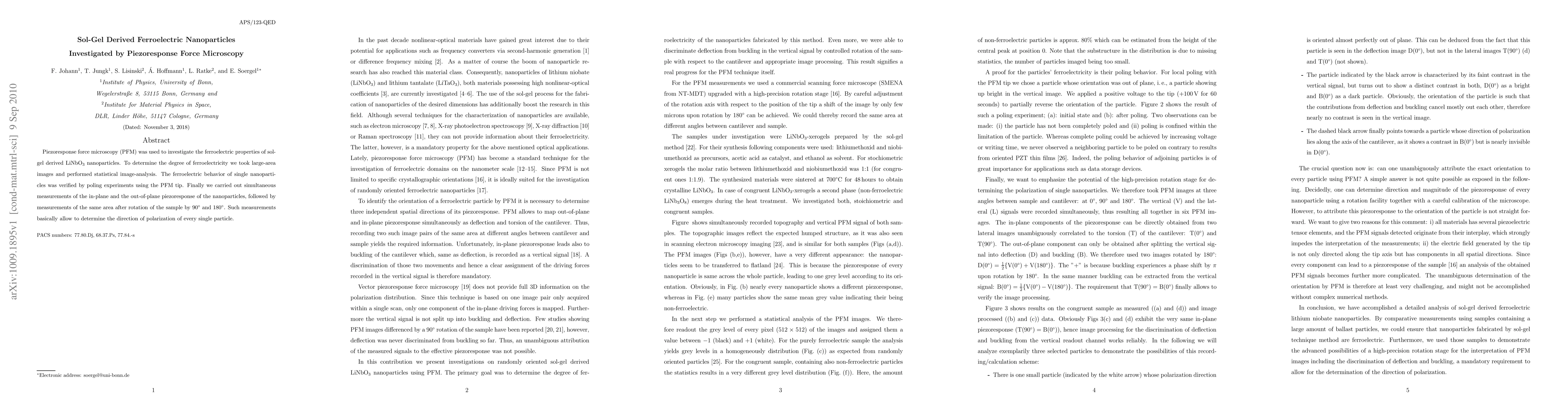 Piezoresponse force microscopy (PFM) was used to investigate the ferroelectric properties of sol-gel derived LiNbO$_3$ nanoparticles. To determine the degree of ferroelectricity we took large-area images and performed statistical image-analysis. The ferroelectric behavior of single nanoparticles was verified by poling experiments using the PFM tip. Finally we carried out simultaneous measurements of the in-plane and the out-of-plane piezoresponse of the nanoparticles, followed by measurements of the same area after rotation of the sample by 90$^{\circ}$ and 180$^{\circ}$. Such measurements basically allow to determine the direction of polarization of every single particle.