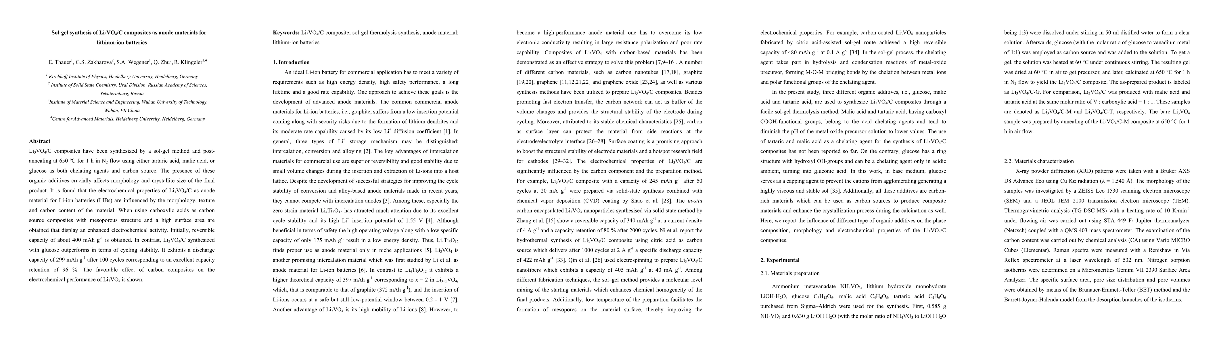 This paper reports on the synthesis of Li3VO4/C composites via sol-gel method and post-annealing, showing that organic additives influence morphology and crystallite size. The composites exhibit enhanced electrochemical performance, with those synthesized using carboxylic acids showing better initial capacity, while those made with glucose demonstrating superior cycling stability.