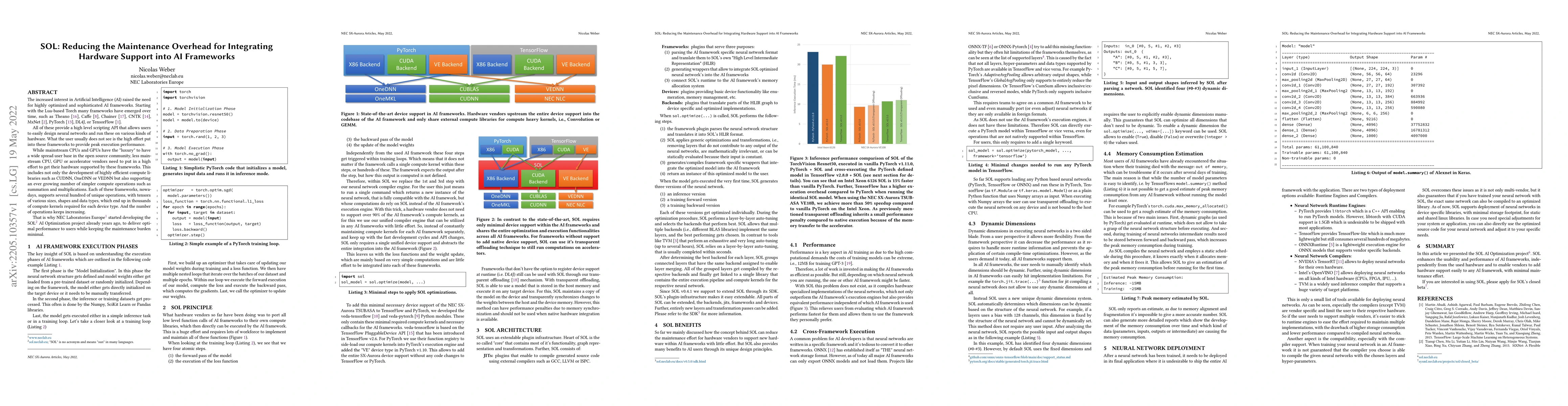 The increased interest in Artificial Intelligence (AI) raised the need for highly optimized and sophisticated AI frameworks. Starting with the Lua-based Torch many frameworks have emerged over time, such as Theano, Caffe, Chainer, CNTK, MxNet, PyTorch, DL4J, or TensorFlow. All of these provide a high level scripting API that allows users to easily design neural networks and run these on various kinds of hardware. What the user usually does not see is the high effort put into these frameworks to provide peak execution performance. While mainstream CPUs and GPUs have the "luxury" to have a wide spread user base in the open source community, less mainstream CPU, GPU or accelerator vendors need to put in a high effort to get their hardware supported by these frameworks. This includes not only the development of highly efficient compute libraries such as CUDNN, OneDNN or VEDNN but also supporting an ever growing number of simpler compute operations such as summation and multiplications. Each of these frameworks, nowadays, supports several hundred of unique operations, with tensors of various sizes, shapes and data types, which end up in thousands of compute kernels required for each device type. And the number of operations keeps increasing. That is why NEC Laboratories Europe started developing the SOL AI Optimization project already years ago, to deliver optimal performance to users while keeping the maintenance burden minimal.