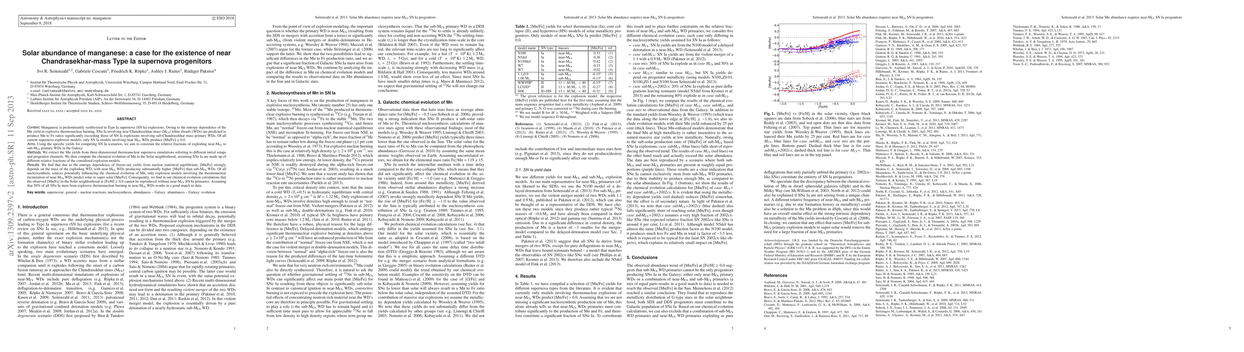 This paper investigates the solar abundance of manganese, attributing its synthesis to Type Ia supernovae. The study finds that near-Chandrasekhar-mass white dwarf progenitors produce significantly higher manganese-to-iron ratios than sub-Chandrasekhar mass progenitors, suggesting that these near-Chandrasekhar mass progenitors are essential to reproduce the observed solar [Mn/Fe] ratio.