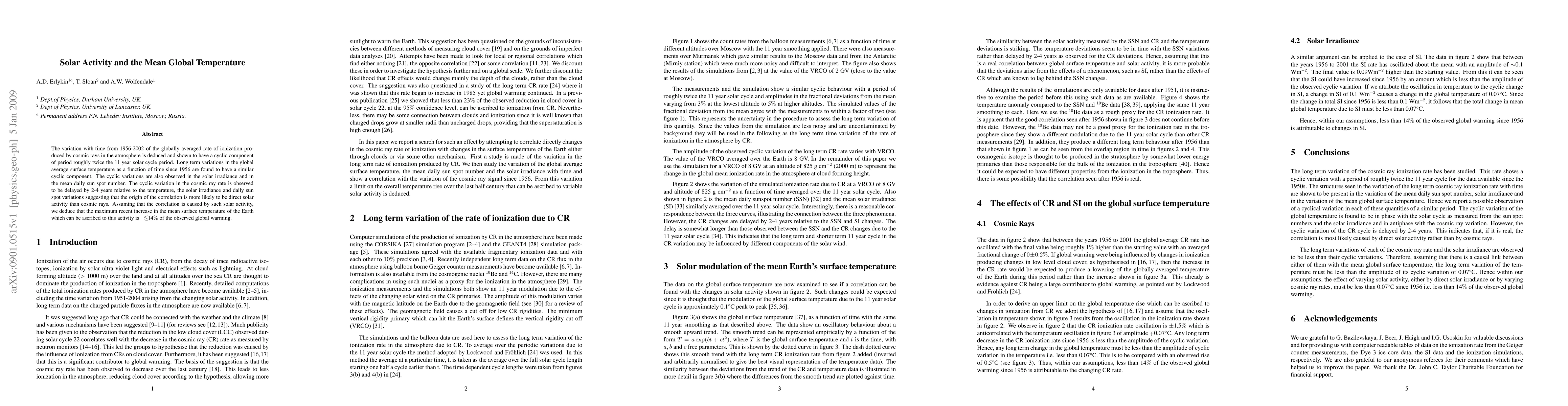 This paper investigates the correlation between solar activity and global temperature from 1956-2002, finding cyclic components in cosmic ray ionization, global temperature, solar irradiance, and sunspot numbers. The study suggests that the cyclic variation in cosmic ray rate lags behind the others, indicating that solar activity likely drives the correlation, contributing at most 14% to recent global warming.