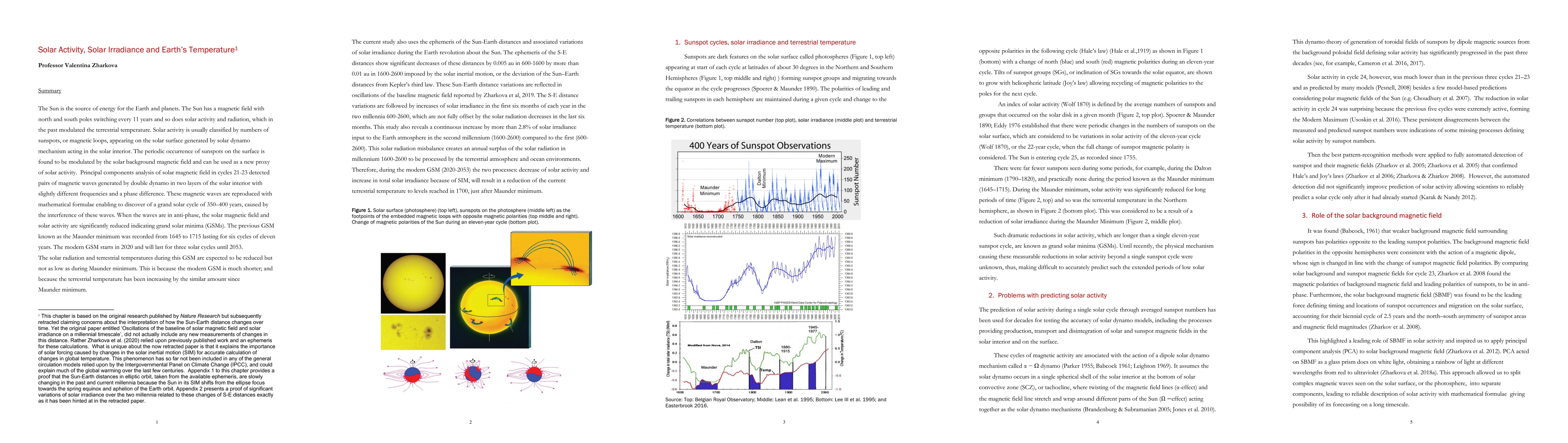 In this study we overview recent advances with prediction of solar activity using as a proxy solar background magnetic field and detection of grand solar cycles of about 400 years separated by grand solar minima (GSMs).The previous GSM known as the Maunder minimum was recorded from 1645 to 1715. The terrestrial temperature during Maunder Minimum was reduced by up to 1.0C that led to freezing rivers, cold winters and summers. The modern GSM started in 2020 and will last for three solar cycles until 2053. During this GSM two processes will affect the input of solar radiation: a decrease of solar activity and an increase in total solar irradiance because of solar inertial motion (SIM). For evaluation of the latter this study uses daily ephemeris of the Sun-Earth (SE) distances in two millennia from 600 to 2600 showing significant decreases of SE distances in the first 6 months of a year by 0.005 au in 600 to 1600 and by more than 0.01 au in 1600 to 2600 with consequent increases of SE distances in the second halves of a year. Although, these increases are not fully symmetric in the second millennium (1600 to 2600), during which the longest SE distances are gradually shifted from 21 June to 15 July in 2600 while the shortest ones from 21 December to 15 January. These distance variations impose significant increases of solar irradiance in the first six months of each year in the two millennia, which are not fully offset by the solar radiation decreases in the last six months in millennium 1600 to 2600. This misbalance creates an annual surplus of solar radiation to be processed by the terrestrial atmosphere and ocean environments that can lead to an increase of terrestrial temperature. We estimate that decrease of solar activity during GSM combined with its increase imposed by SIM will lead to a reduction of terrestrial temperature during the modern GSM to the levels of 1700.