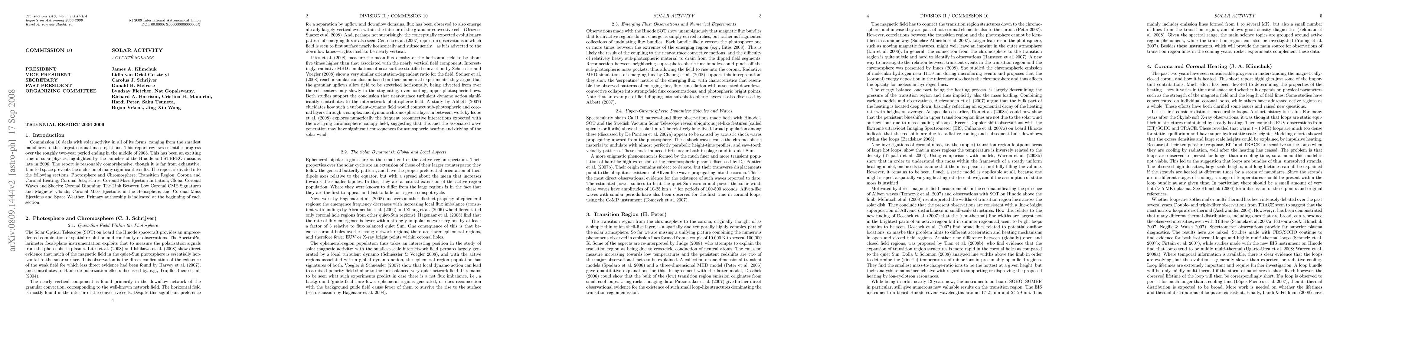 This triennial report from IAU Commission 10 covers solar activity from 2006 to mid-2008, highlighting significant scientific advancements, particularly the launches of Hinode and STEREO missions. It comprehensively reviews various aspects of solar physics, though due to space constraints, not all significant results are included.