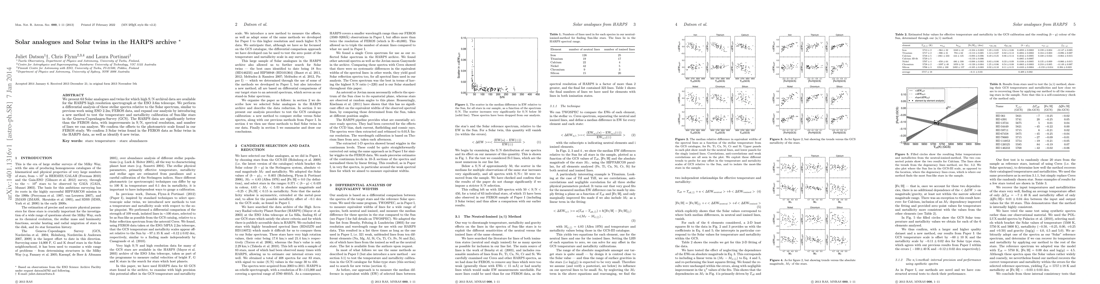 We present 63 Solar analogues and twins for which high S/N archival data are available for the HARPS high resolution spectrograph at the ESO 3.6m telescope. We perform a differential analysis of these stellar spectra relative to the Solar spectrum, similar to previous work using ESO 2.2m/FEROS data, and expand our analysis by introducing a new method to test the temperature and metallicity calibration of Sun-like stars in the Geneva-Copenhagen-Survey (GCS). The HARPS data are significantly better than the FEROS data, with improvements in S/N, spectral resolution, and number of lines we can analyse. We confirm the offsets to the photometric scale found in our FEROS study. We confirm 3 Solar twins found in the FEROS data as Solar twins in the HARPS data, as well as identify 6 new twins.