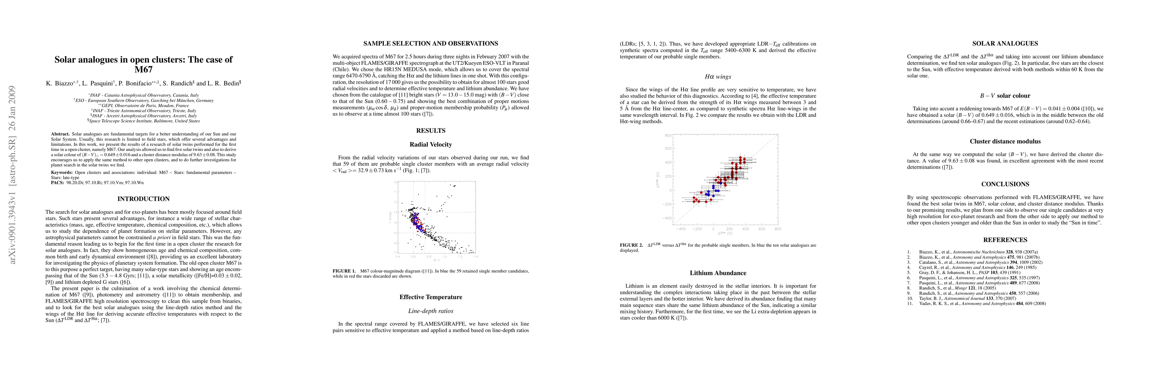 This study identifies five solar twins within the open cluster M67, marking the first such research in a cluster setting. The analysis yields a solar colour of (B-V)0=0.649±0.016 and a cluster distance modulus of 9.63±0.08, suggesting potential for further planet searches in these solar analogues.