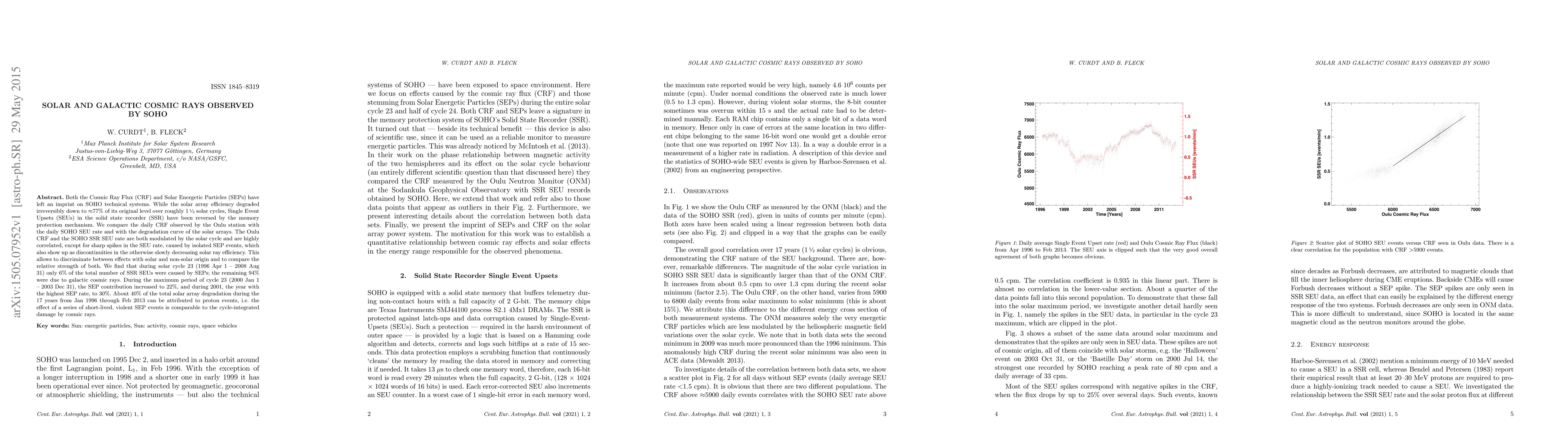 Both the Cosmic Ray Flux (CRF) and Solar Energetic Particles (SEPs) have left an imprint on SOHO technical systems. While the solar array efficiency degraded irreversibly down to ~77% of its original level over roughly 1 1/2 solar cycles, Single Event Upsets (SEUs) in the solid state recorder (SSR) have been reversed by the memory protection mechanism. We compare the daily CRF observed by the Oulu station with the daily SOHO SEU rate and with the Degradation curve of the solar arrays. The Oulu CRF and the SOHO SSR SEU rate are both modulated by the solar cycle and are highly correlated, except for sharp spikes in the SEU rate, caused by isolated SEP events, which also show up as discontinuities in the otherwise slowly decreasing solar ray efficiency. This allows to discriminate between effects with solar and non-solar origin and to compare the relative strength of both. We find that during solar cycle 23 (1996 Apr 1 -- 2008 Aug 31) only 6% of the total number of SSR SEUs were caused by SEPs; the remaining 94% were due to galactic cosmic rays. During the maximum period of cycle 23 (2000 Jan 1 -- 2003 Dec 31), the SEP contribution increased to 22%, and during 2001, the year with the highest SEP rate, to 30%. About 40% of the total solar array degradation during the 17 years from Jan 1996 through Feb 2013 can be attributed to proton events, i.e. the effect of a series of short-lived, violent SEP events is comparable to the cycle-integrated damage by cosmic rays.