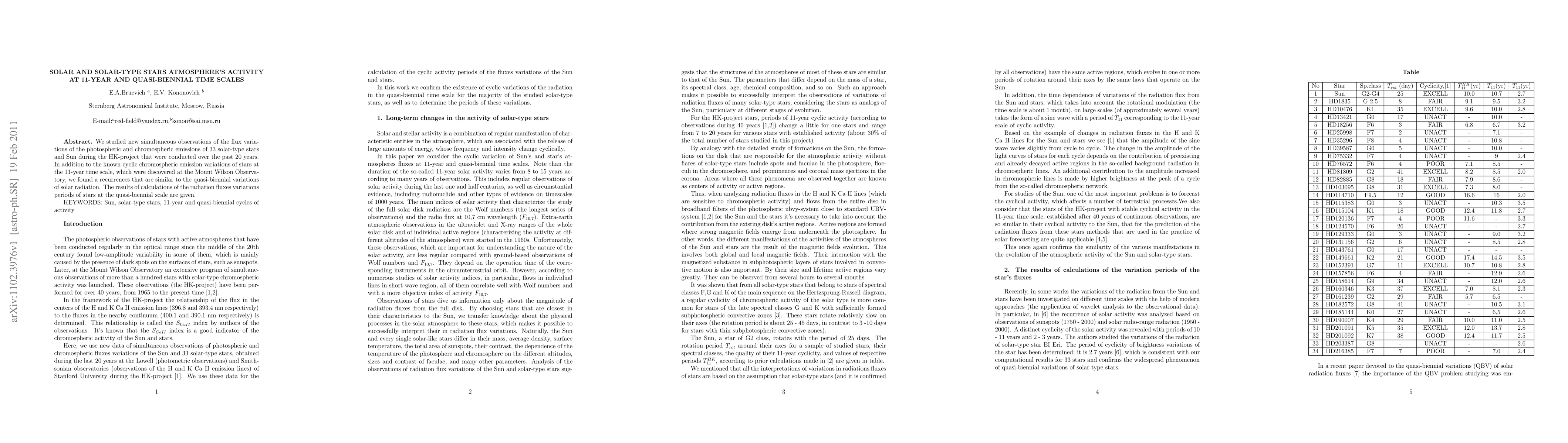 We studied new simultaneous observations of the flux variations of the photospheric and chromospheric emissions of 33 solar-type stars and Sun during the HK-project that were conducted over the past 20 years. In addition to the known cyclic chromospheric emission variations of stars at the 11-year time scale, which were discovered at the Mount Wilson Observatory, we found a recurrences that are similar to the quasi-biennial variations of solar radiation. The results of calculations of the radiation fluxes variations periods of stars at the quasi-biennial scale are given.