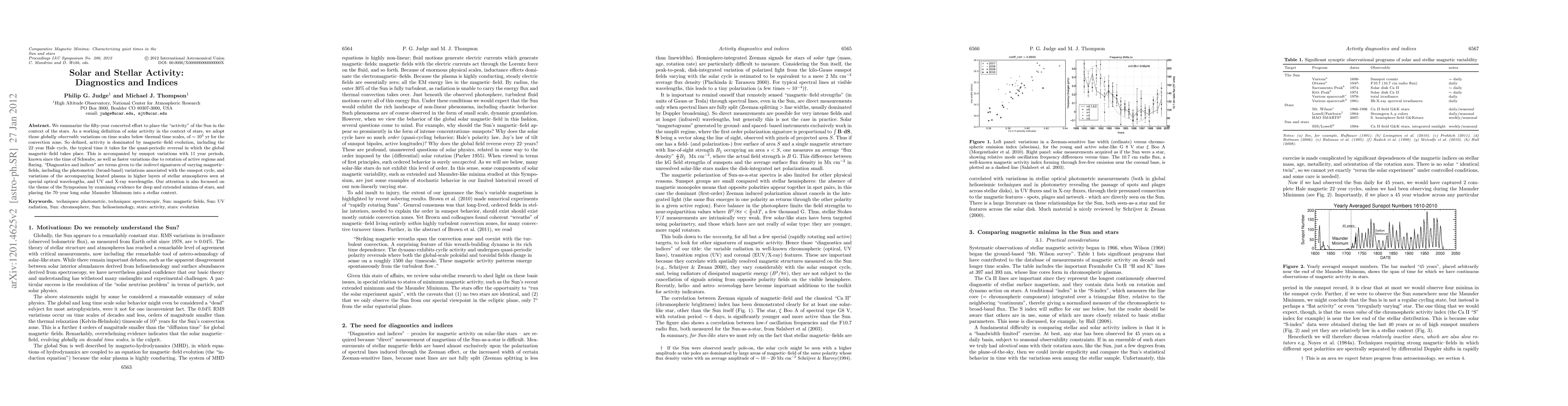We summarize the fifty-year concerted effort to place the "activity" of the Sun in the context of the stars. As a working definition of solar activity in the context of stars, we adopt those globally-observable variations on time scales below thermal time scales, of ~ 100,000 yr for the convection zone. So defined, activity is dominated by magnetic-field evolution, including the 22-year Hale cycle, the typical time it takes for the quasi-periodic reversal in which the global magnetic-field takes place. This is accompanied by sunspot variations with 11 year periods, known since the time of Schwabe, as well as faster variations due to rotation of active regions and flaring. "Diagnostics and indices" are terms given to the indirect signatures of varying magnetic- fields, including the photometric (broad-band) variations associated with the sunspot cycle, and variations of the accompanying heated plasma in higher layers of stellar atmospheres seen at special optical wavelengths, and UV and X-ray wavelengths. Our attention is also focussed on the theme of the Symposium by examining evidence for deep and extended minima of stars, and placing the 70-year long solar Maunder Minimum into a stellar context.